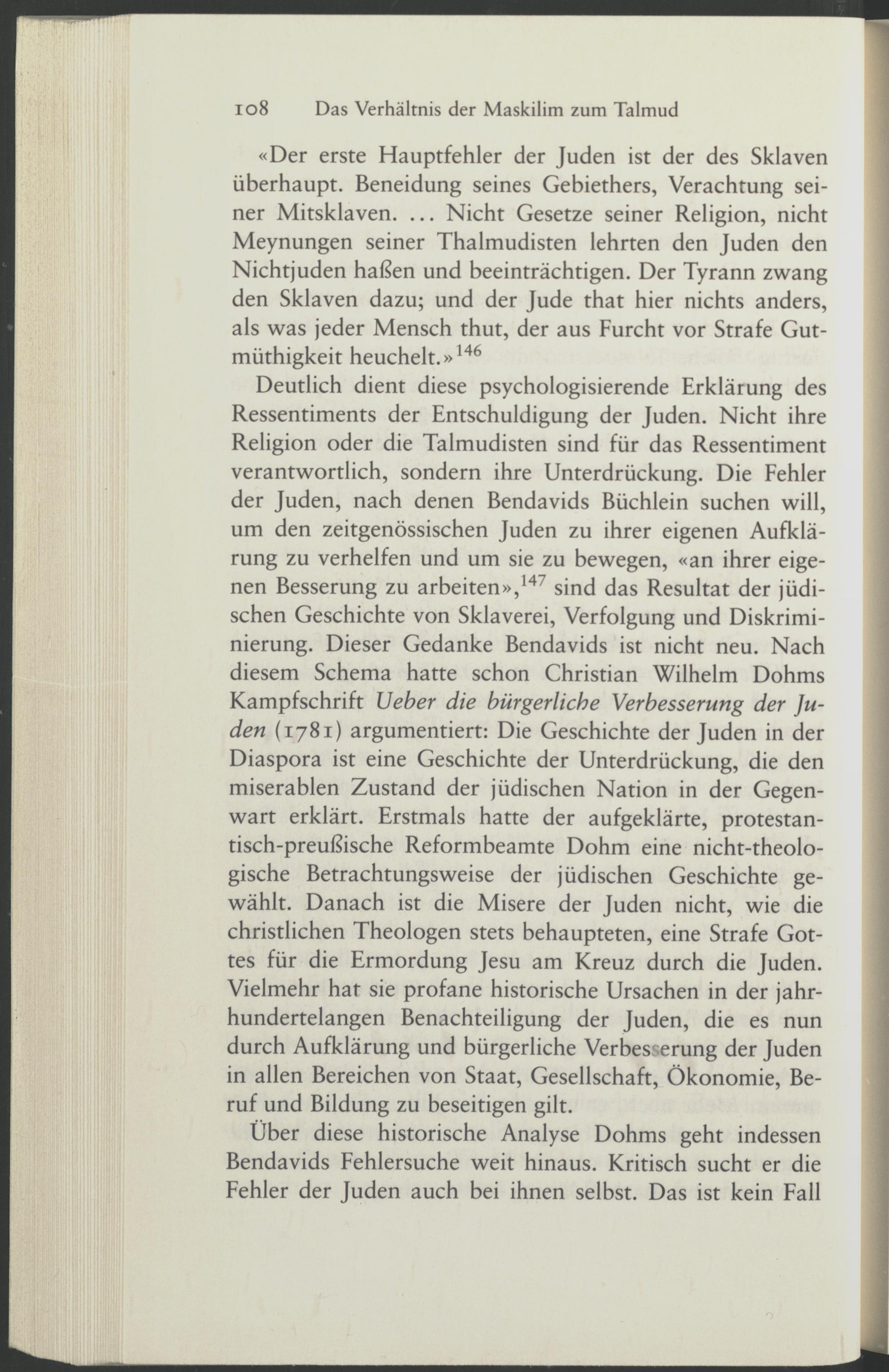 Deutlich dient diese psychologisierende Erklärung des Ressentiments der Entschuldigung der Juden. Nicht ihre Religion oder die Talmudisten sind für das Ressentiment verantwortlich, sondern ihre Unterdrückung. Die Fehler der Juden, nach denen Bendavids Büchlein suchen will, um den zeitgenössischen Juden zu ihrer eigenen Aufklärung zu verhelfen und um sie zu bewegen, «an ihrer eigenen Besserung zu arbeiten», 147 sind das Resultat der jüdischen Geschichte von Sklaverei, Verfolgung und Diskriminierung. Dieser Gedanke Bendavids ist nicht neu. Nach diesem Schema hatte schon Christian Wilhelm Dohms Kampfschrift Ueber die bürgerliche Verbesserung der Juden (1781) argumentiert: Die Geschichte der Juden in der Diaspora ist eine Geschichte der Unterdrückung, die den miserablen Zustand der jüdischen Nation in der Gegenwart erklärt. Erstmals hatte der aufgeklärte, protestantisch-preußische Reformbeamte Dohm eine nicht-theologische Betrachtungsweise der jüdischen Geschichte gewählt. Danach ist die Misere der Juden nicht, wie die christlichen Theologen stets behaupteten, eine Strafe Gottes für die Ermordung Jesu am Kreuz durch die Juden. Vielmehr hat sie profane historische Ursachen in der jahrhundertelangen Benachteiligung der Juden, die es nun durch Aufklärung und bürgerliche Verbesserung der Juden in allen Bereichen von Staat, Gesellschaft, Ökonomie, Beruf und Bildung zu beseitigen gilt.