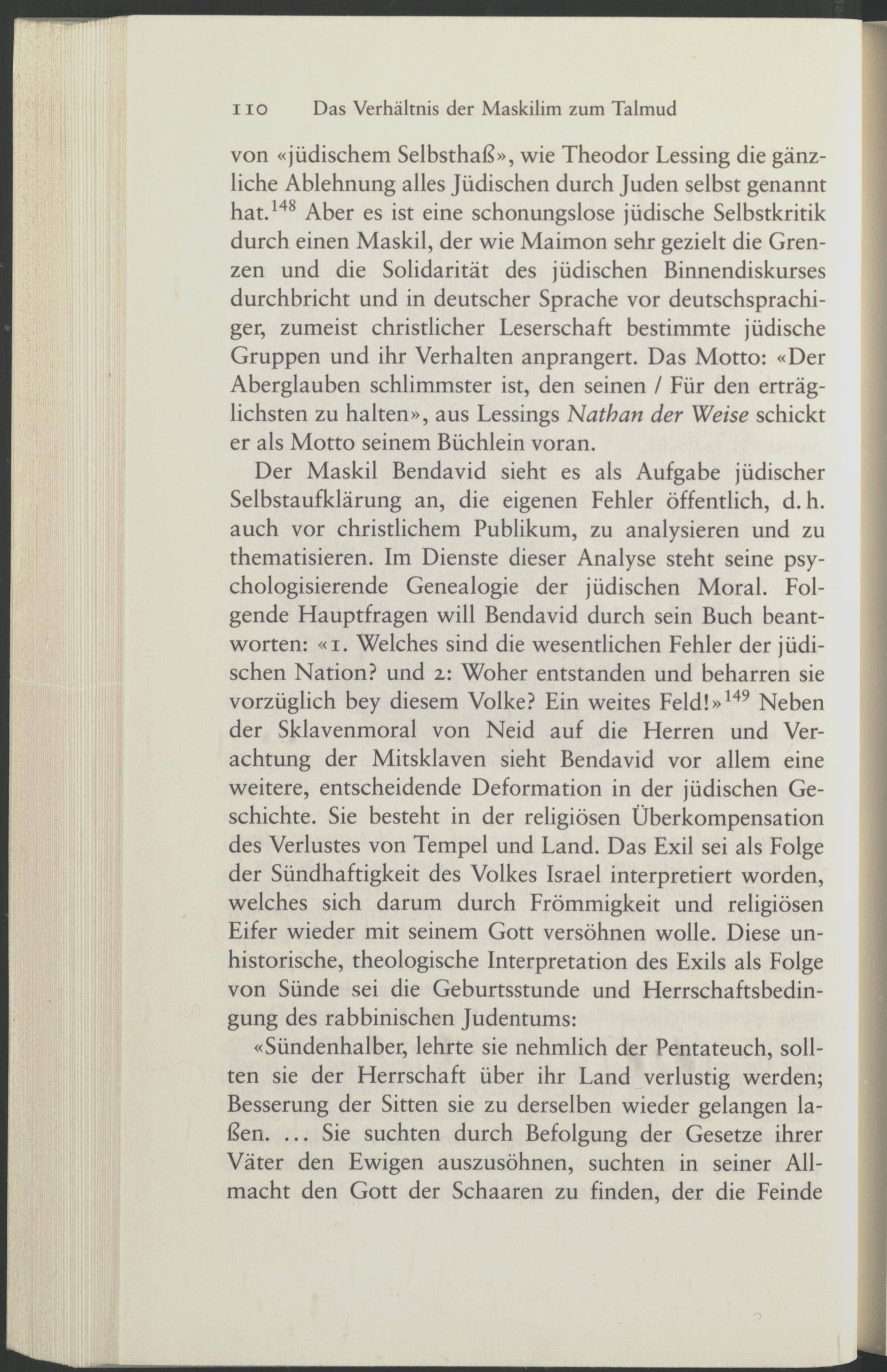 von «jüdischem Selbsthaß», wie Theodor Lessing die gänzliche Ablehnung alles Jüdischen durch Juden selbst genannt hat . 148 Aber es ist eine schonungslose jüdische Selbstkritik durch einen Maskil, der wie Maimon sehr gezielt die Grenzen und die Solidarität des jüdischen Binnendiskurses durchbricht und in deutscher Sprache vor deutschsprachiger, zumeist christlicher Leserschaft bestimmte jüdische Gruppen und ihr Verhalten anprangert. Das Motto: «Der Aberglauben schlimmster ist, den seinen / Für den erträglichsten zu halten», aus Lessings Nathan der Weise schickt er als Motto seinem Büchlein voran.