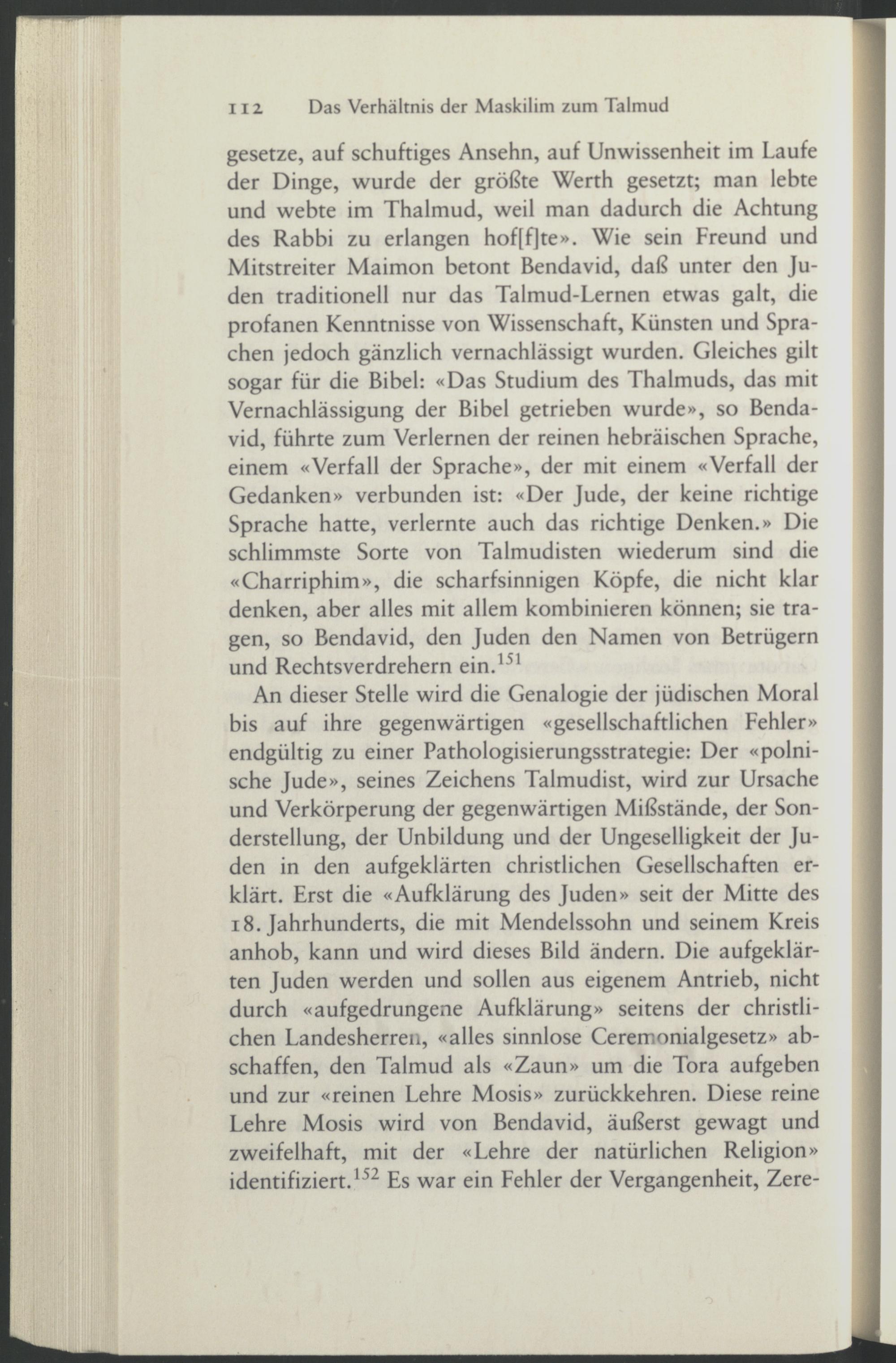 gesetze, auf schuftiges Ansehn, auf Unwissenheit im Laufe der Dinge, wurde der größte Werth gesetzt; man lebte und webte im Thalmud, weil man dadurch die Achtung des Rabbi zu erlangen hof[f]te». Wie sein Freund und Mitstreiter Maimon betont Bendavid, daß unter den Juden traditionell nur das Talmud-Lernen etwas galt, die profanen Kenntnisse von Wissenschaft, Künsten und Sprachen jedoch gänzlich vernachlässigt wurden. Gleiches gilt sogar für die Bibel: «Das Studium des Thalmuds, das mit Vernachlässigung der Bibel getrieben wurde», so Bendavid, führte zum Verlernen der reinen hebräischen Sprache, einem «Verfall der Sprache», der mit einem «Verfall der Gedanken» verbunden ist: «Der Jude, der keine richtige Sprache hatte, verlernte auch das richtige Denken.» Die schlimmste Sorte von Talmudisten wiederum sind die «Charriphim», die scharfsinnigen Köpfe, die nicht klar denken, aber alles mit allem kombinieren können; sie tragen, so Bendavid, den Juden den Namen von Betrügern und Rechtsverdrehern ein. 151