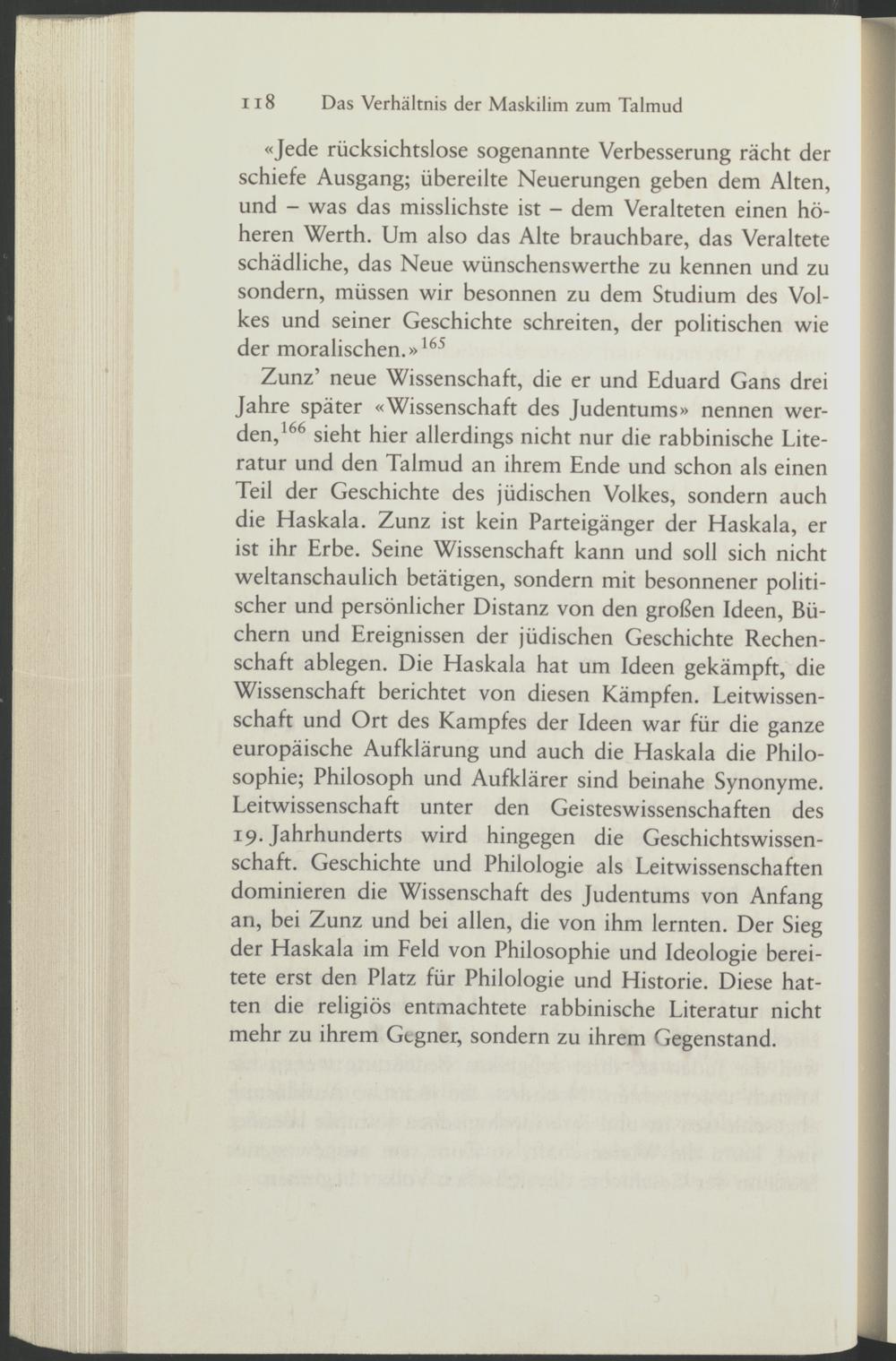 Zunz’ neue Wissenschaft, die er und Eduard Gans drei Jahre später «Wissenschaft des Judentums» nennen werden, 166 sieht hier allerdings nicht nur die rabbinische Literatur und den Talmud an ihrem Ende und schon als einen Teil der Geschichte des jüdischen Volkes, sondern auch die Haskala. Zunz ist kein Parteigänger der Haskala, er ist ihr Erbe. Seine Wissenschaft kann und soll sich nicht weltanschaulich betätigen, sondern mit besonnener politischer und persönlicher Distanz von den großen Ideen, Büchern und Ereignissen der jüdischen Geschichte Rechenschaft ablegen. Die Haskala hat um Ideen gekämpft, die Wissenschaft berichtet von diesen Kämpfen. Leitwissenschaft und Ort des Kampfes der Ideen war für die ganze europäische Aufklärung und auch die Haskala die Philosophie; Philosoph und Aufklärer sind beinahe Synonyme. Leitwissenschaft unter den Geisteswissenschaften des 19. Jahrhunderts wird hingegen die Geschichtswissenschaft. Geschichte und Philologie als Leitwissenschaften dominieren die Wissenschaft des Judentums von Anfang an, bei Zunz und bei allen, die von ihm lernten. Der Sieg der Haskala im Feld von Philosophie und Ideologie bereitete erst den Platz für Philologie und Historie. Diese hatten die religiös entmachtete rabbinische Literatur nicht mehr zu ihrem Gegner, sondern zu ihrem Gegenstand.