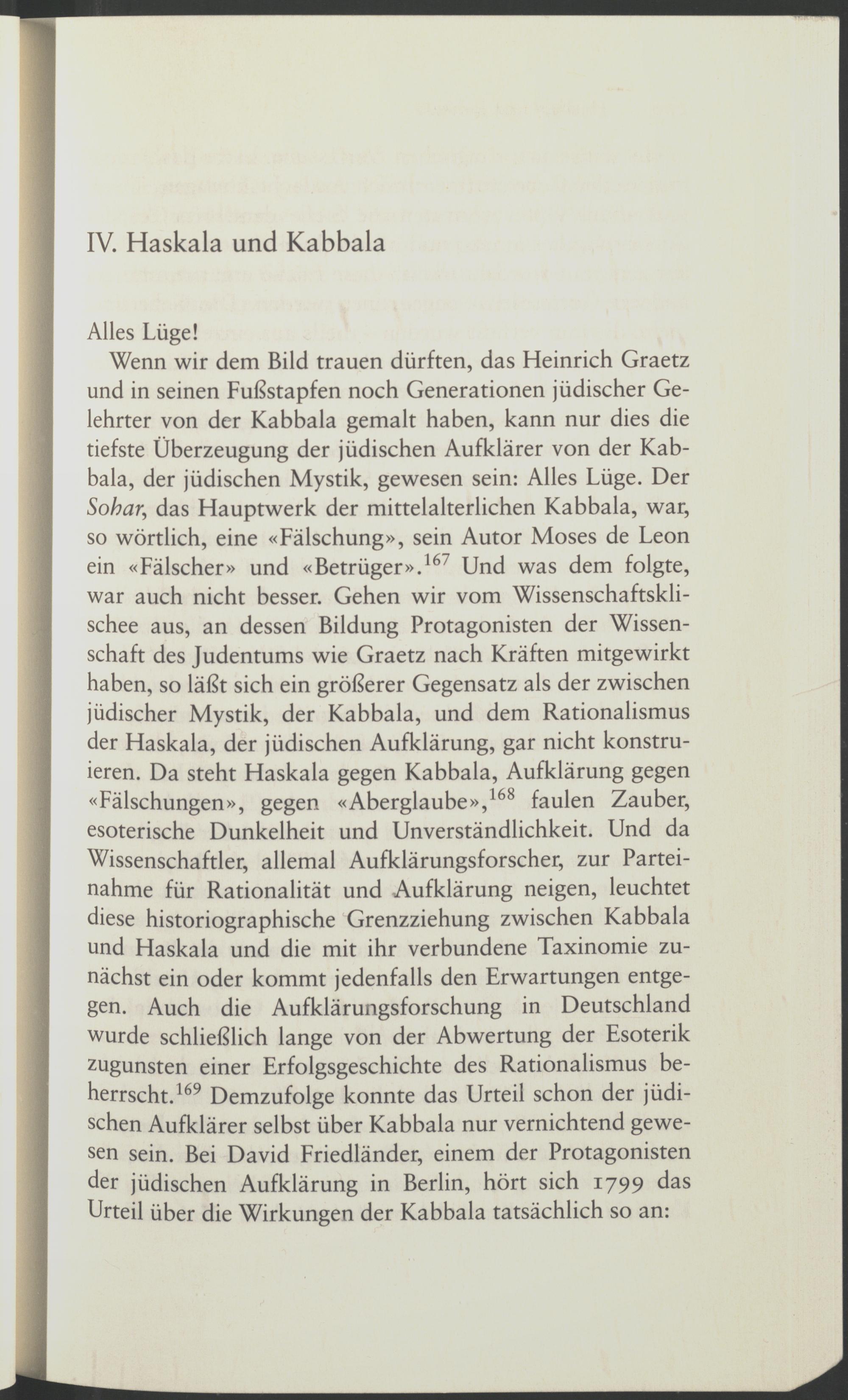 Wenn wir dem Bild trauen dürften, das Heinrich Graetz und in seinen Fußstapfen noch Generationen jüdischer Gelehrter von der Kabbala gemalt haben, kann nur dies die tiefste Überzeugung der jüdischen Aufklärer von der Kabbala, der jüdischen Mystik, gewesen sein: Alles Lüge. Der Sohar, das Hauptwerk der mittelalterlichen Kabbala, war, so wörtlich, eine «Fälschung», sein Autor Moses de Leon ein «Fälscher» und «Betrüger». 167 Und was dem folgte, war auch nicht besser. Gehen wir vom Wissenschaftsklischee aus, an dessen Bildung Protagonisten der Wissenschaft des Judentums wie Graetz nach Kräften mitgewirkt haben, so läßt sich ein größerer Gegensatz als der zwischen jüdischer Mystik, der Kabbala, und dem Rationalismus der Haskala, der jüdischen Aufklärung, gar nicht konstruieren. Da steht Haskala gegen Kabbala, Aufklärung gegen «Fälschungen», gegen «Aberglaube», 168 faulen Zauber, esoterische Dunkelheit und Unverständlichkeit. Und da Wissenschaftler, allemal Aufklärungsforscher, zur Parteinahme für Rationalität und Aufklärung neigen, leuchtet diese historiographische Grenzziehung zwischen Kabbala und Haskala und die mit ihr verbundene Taxinomie zunächst ein oder kommt jedenfalls den Erwartungen entgegen. Auch die Aufklärungsforschung in Deutschland wurde schließlich lange von der Abwertung der Esoterik zugunsten einer Erfolgsgeschichte des Rationalismus beherrscht. 169 Demzufolge konnte das Urteil schon der jüdischen Aufklärer selbst über Kabbala nur vernichtend gewesen sein. Bei David Friedländer, einem der Protagonisten der jüdischen Aufklärung in Berlin, hört sich 1799 das Urteil über die Wirkungen der Kabbala tatsächlich so an: