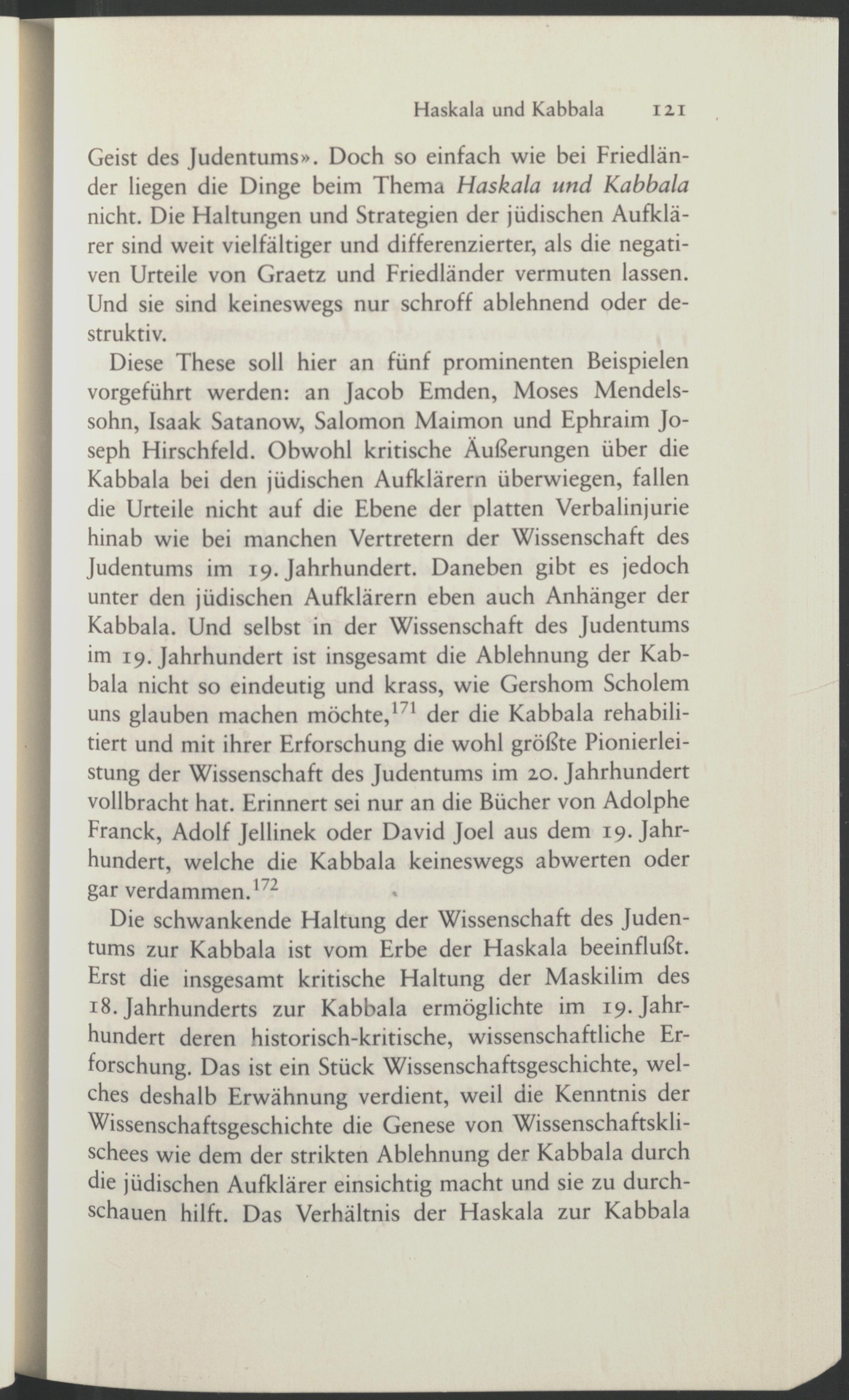 Diese These soll hier an fünf prominenten Beispielen vorgeführt werden: an Jacob Emden, Moses Mendelssohn, Isaak Satanow, Salomon Maimon und Ephraim Joseph Hirschfeld. Obwohl kritische Äußerungen über die Kabbala bei den jüdischen Aufklärern überwiegen, fallen die Urteile nicht auf die Ebene der platten Verbalinjurie hinab wie bei manchen Vertretern der Wissenschaft des Judentums im 19. Jahrhundert. Daneben gibt es jedoch unter den jüdischen Aufklärern eben auch Anhänger der Kabbala. Und selbst in der Wissenschaft des Judentums im 19. Jahrhundert ist insgesamt die Ablehnung der Kabbala nicht so eindeutig und krass, wie Gershom Scholem uns glauben machen möchte, 171 der die Kabbala rehabilitiert und mit ihrer Erforschung die wohl größte Pionierleistung der Wissenschaft des Judentums im 20. Jahrhundert vollbracht hat. Erinnert sei nur an die Bücher von Adolphe Franck, Adolf Jellinek oder David Joel aus dem 19. Jahrhundert, welche die Kabbala keineswegs abwerten oder gar verdammen. 172