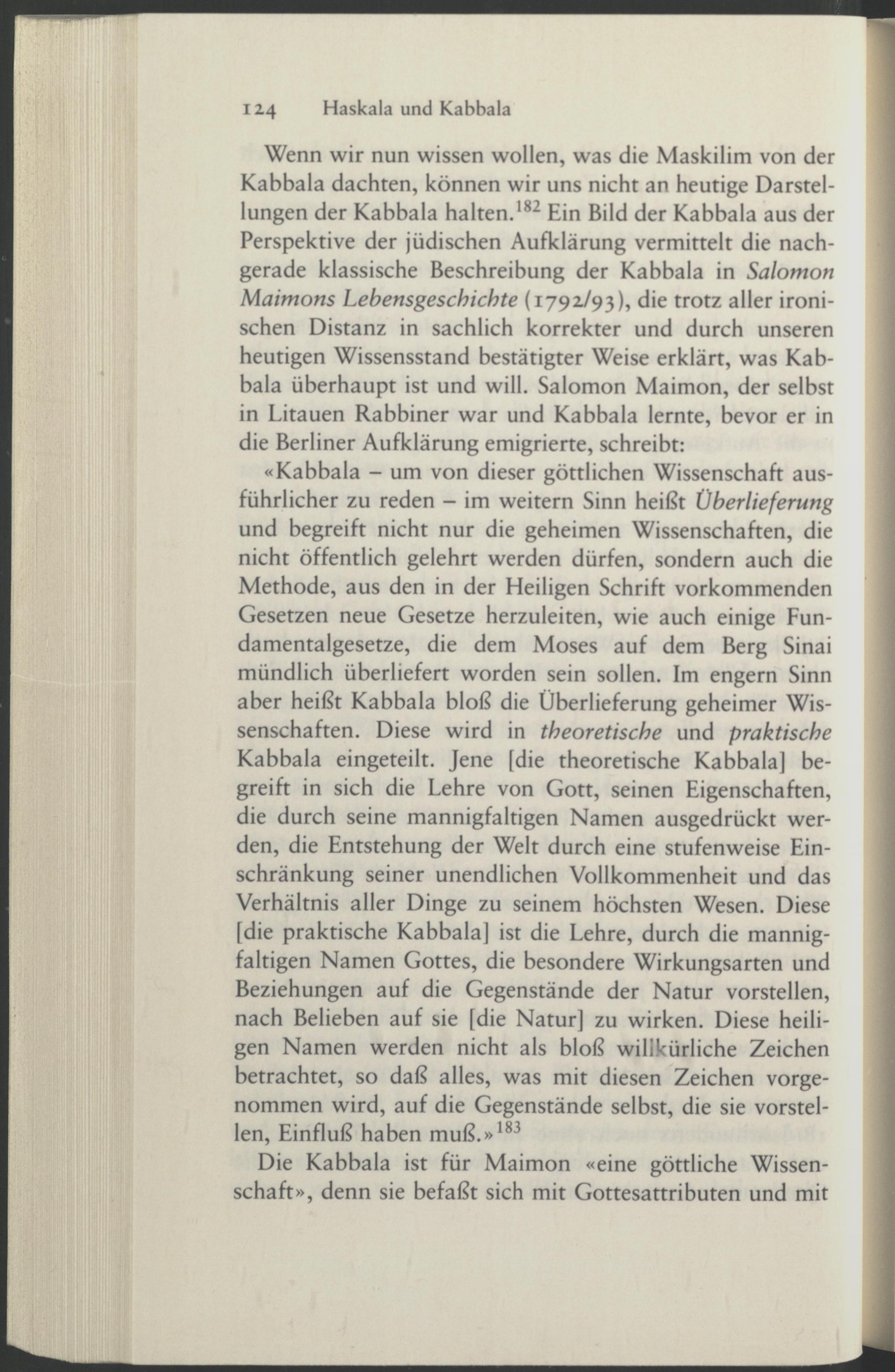 Wenn wir nun wissen wollen, was die Maskilim von der Kabbala dachten, können wir uns nicht an heutige Darstellungen der Kabbala halten. 182 Ein Bild der Kabbala aus der Perspektive der jüdischen Aufklärung vermittelt die nachgerade klassische Beschreibung der Kabbala in Salomon Maimons Lebensgeschichte (1792/93), die trotz aller ironischen Distanz in sachlich korrekter und durch unseren heutigen Wissensstand bestätigter Weise erklärt, was Kabbala überhaupt ist und will. Salomon Maimon, der selbst in Litauen Rabbiner war und Kabbala lernte, bevor er in die Berliner Aufklärung emigrierte, schreibt: