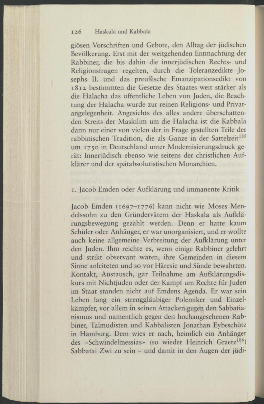 Jacob Emden (1697-1776) kann nicht wie Moses Mendelssohn zu den Gründervätern der Haskala als Aufklärungsbewegung gezählt werden. Denn er hatte kaum Schüler oder Anhänger, er war unorganisiert, und er wollte auch keine allgemeine Verbreitung der Aufklärung unter den Juden. Ihm reichte es, wenn einige Rabbiner gelehrt und strikt observant waren, ihre Gemeinden in diesem Sinne anleiteten und so vor Häresie und Sünde bewahrten. Kontakt, Austausch, gar Teilnahme am Aufklärungsdiskurs mit Nichtjuden oder der Kampf um Rechte für Juden im Staat standen nicht auf Emdens Agenda. Er war sein Leben lang ein strenggläubiger Polemiker und Einzelkämpfer, vor allem in seinen Attacken gegen den Sabbatia- nismus und namentlich gegen den hochangesehenen Rabbiner, Talmudisten und Kabbalisten Jonathan Eybeschütz in Hamburg. Dem wies er nach, heimlich ein Anhänger des «Schwindelmessias» (so wieder Heinrich Graetz 186 ) Sabbatai Zwi zu sein - und damit in den Augen der jüdi-