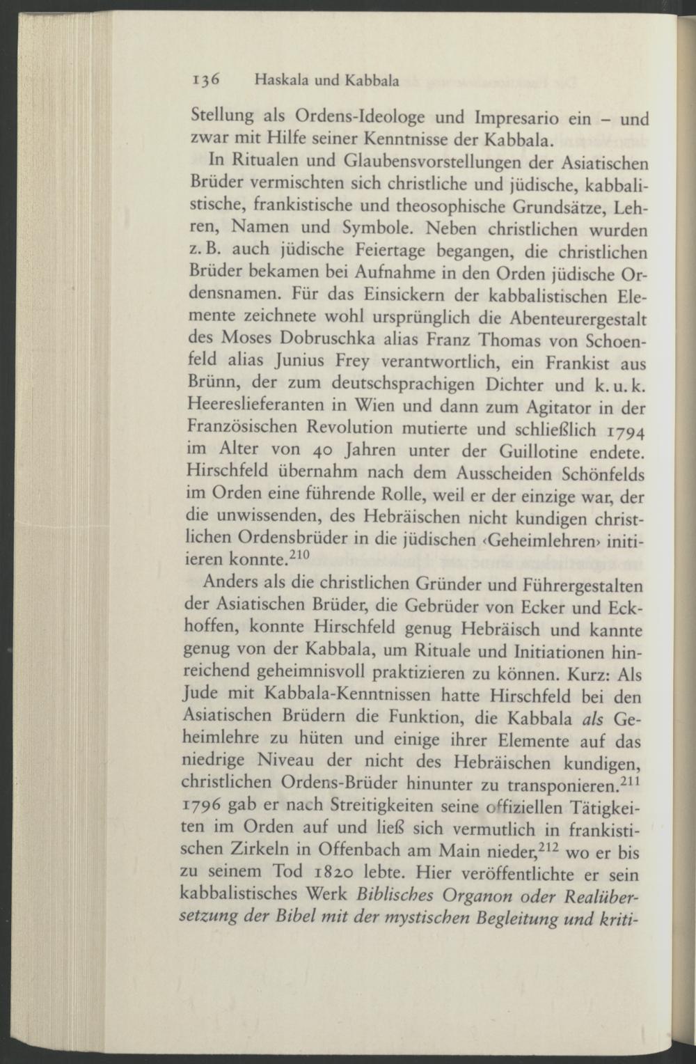 Anders als die christlichen Gründer und Führergestalten der Asiatischen Brüder, die Gebrüder von Ecker und Eckhoffen, konnte Hirschfeld genug Hebräisch und kannte genug von der Kabbala, um Rituale und Initiationen hinreichend geheimnisvoll praktizieren zu können. Kurz: Als Jude mit Kabbala-Kenntnissen hatte Hirschfeld bei den Asiatischen Brüdern die Funktion, die Kabbala als Geheimlehre zu hüten und einige ihrer Elemente auf das niedrige Niveau der nicht des Hebräischen kundigen, christlichen Ordens-Brüder hinunter zu transponieren. 211 1796 gab er nach Streitigkeiten seine offiziellen Tätigkeiten im Orden auf und ließ sich vermutlich in frankisti- schen Zirkeln in Offenbach am Main nieder, 212 wo er bis zu seinem Tod 1820 lebte. Hier veröffentlichte er sein kabbalistisches Werk Biblisches Organon oder Realübersetzung der Bibel mit der mystischen Begleitung und kriti-