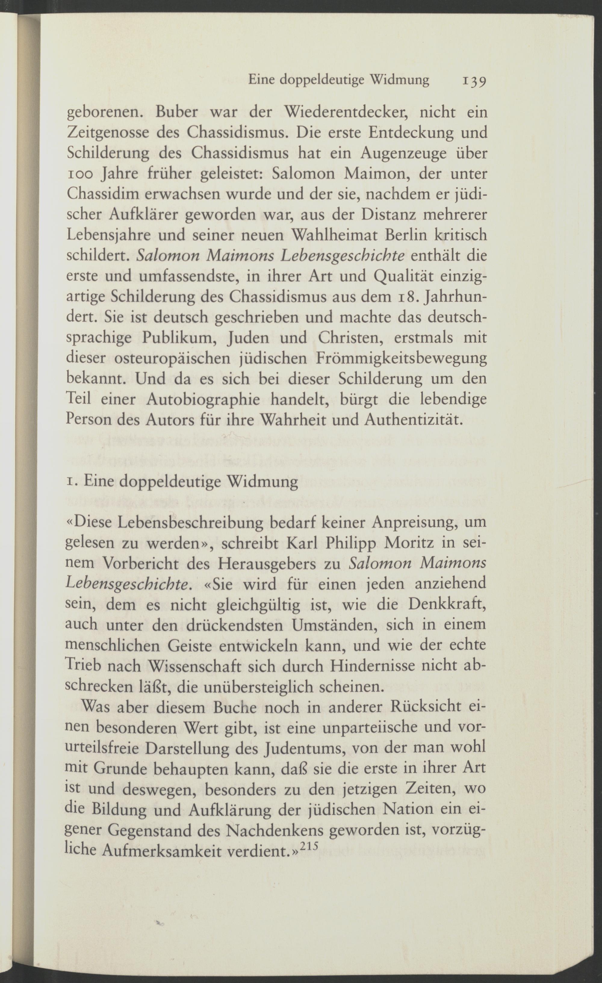 geborenen. Buber war der Wiederentdecker, nicht ein Zeitgenosse des Chassidismus. Die erste Entdeckung und Schilderung des Chassidismus hat ein Augenzeuge über 100 Jahre früher geleistet: Salomon Maimon, der unter Chassidim erwachsen wurde und der sie, nachdem er jüdischer Aufklärer geworden war, aus der Distanz mehrerer Lebensjahre und seiner neuen Wahlheimat Berlin kritisch schildert. Salomon Maimons Lebensgeschichte enthält die erste und umfassendste, in ihrer Art und Qualität einzigartige Schilderung des Chassidismus aus dem 18. Jahrhundert. Sie ist deutsch geschrieben und machte das deutschsprachige Publikum, Juden und Christen, erstmals mit dieser osteuropäischen jüdischen Frömmigkeitsbewegung bekannt. Und da es sich bei dieser Schilderung um den Teil einer Autobiographie handelt, bürgt die lebendige Person des Autors für ihre Wahrheit und Authentizität.