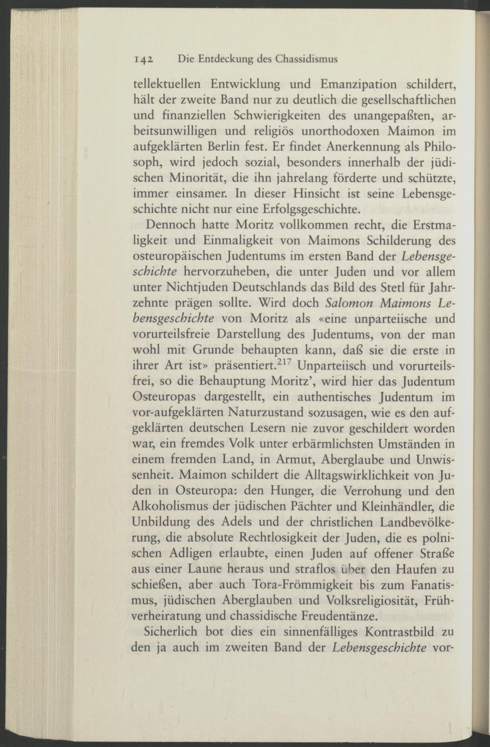 Dennoch hatte Moritz vollkommen recht, die Erstmaligkeit und Einmaligkeit von Maimons Schilderung des osteuropäischen Judentums im ersten Band der Lebensgeschichte hervorzuheben, die unter Juden und vor allem unter Nichtjuden Deutschlands das Bild des Stetl für Jahrzehnte prägen sollte. Wird doch Salomon Maimons Lebensgeschichte von Moritz als «eine unparteiische und vorurteilsfreie Darstellung des Judentums, von der man wohl mit Grunde behaupten kann, daß sie die erste in ihrer Art ist» präsentiert . 217 Unparteiisch und vorurteilsfrei, so die Behauptung Moritz’, wird hier das Judentum Osteuropas dargestellt, ein authentisches Judentum im vor-aufgeklärten Naturzustand sozusagen, wie es den aufgeklärten deutschen Lesern nie zuvor geschildert worden war, ein fremdes Volk unter erbärmlichsten Umständen in j einem fremden Land, in Armut, Aberglaube und Unwissenheit. Maimon schildert die Alltagswirklichkeit von Juden in Osteuropa: den Hunger, die Verrohung und den Alkoholismus der jüdischen Pächter und Kleinhändler, die Unbildung des Adels und der christlichen Landbevölkerung, die absolute Rechtlosigkeit der Juden, die es polnischen Adligen erlaubte, einen Juden auf offener Straße aus einer Laune heraus und straflos über den Haufen zu schießen, aber auch Tora-Frömmigkeit bis zum Fanatismus, jüdischen Aberglauben und Volksreligiosität, Frühverheiratung und chassidische Freudentänze.