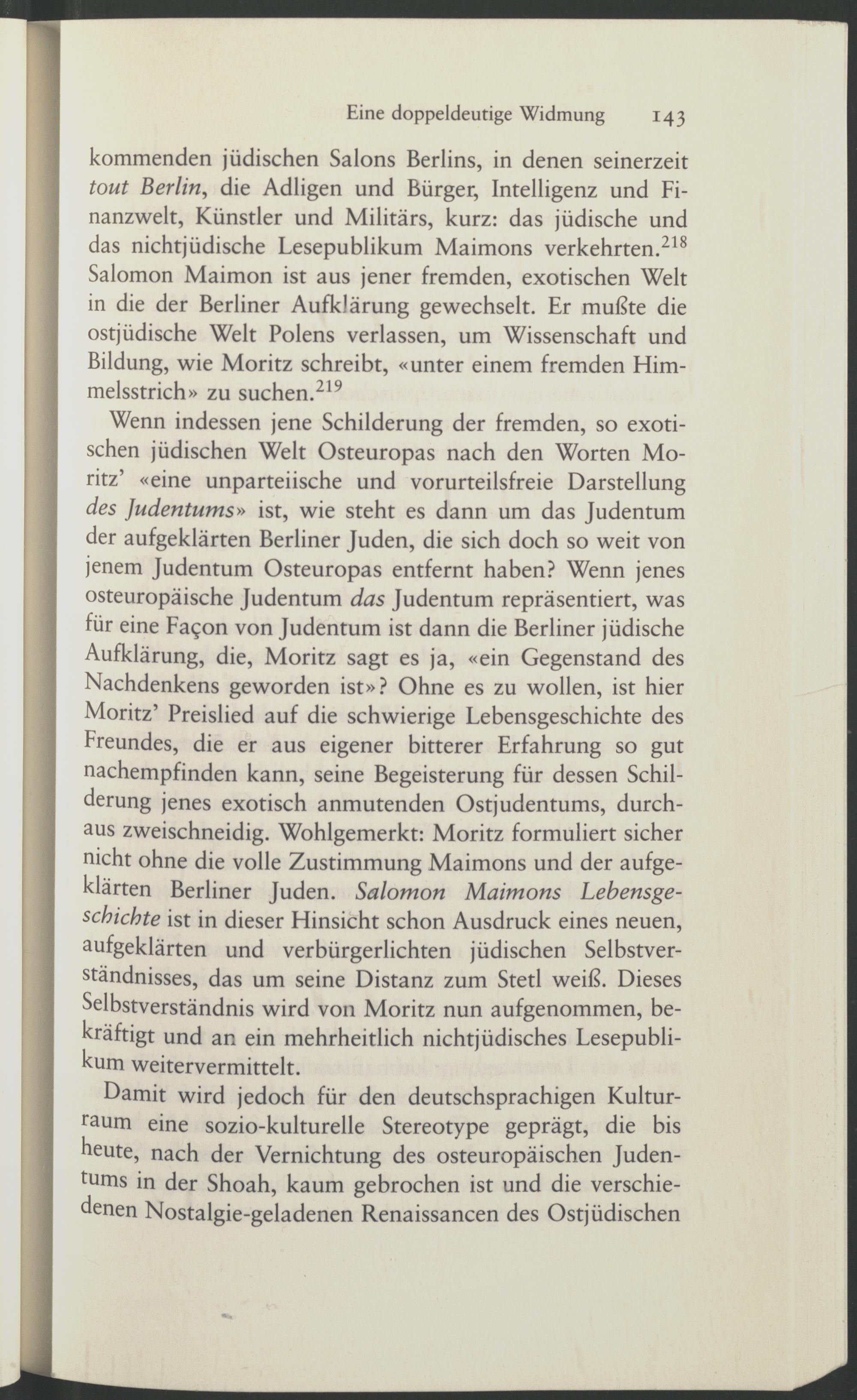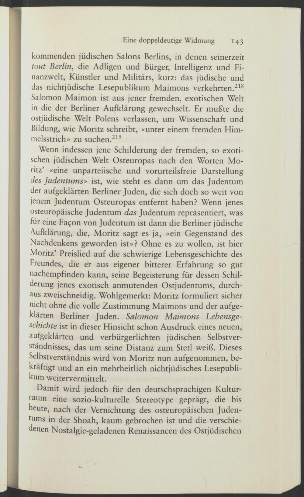 kommenden jüdischen Salons Berlins, in denen seinerzeit tout Berlin, die Adligen und Bürger, Intelligenz und Finanzwelt, Künstler und Militärs, kurz: das jüdische und das nichtjüdische Lesepublikum Maimons verkehrten . 218 Salomon Maimon ist aus jener fremden, exotischen Welt in die der Berliner Aufklärung gewechselt. Er mußte die ostjüdische Welt Polens verlassen, um Wissenschaft und Bildung, wie Moritz schreibt, «unter einem fremden Himmelsstrich» zu suchen . 219