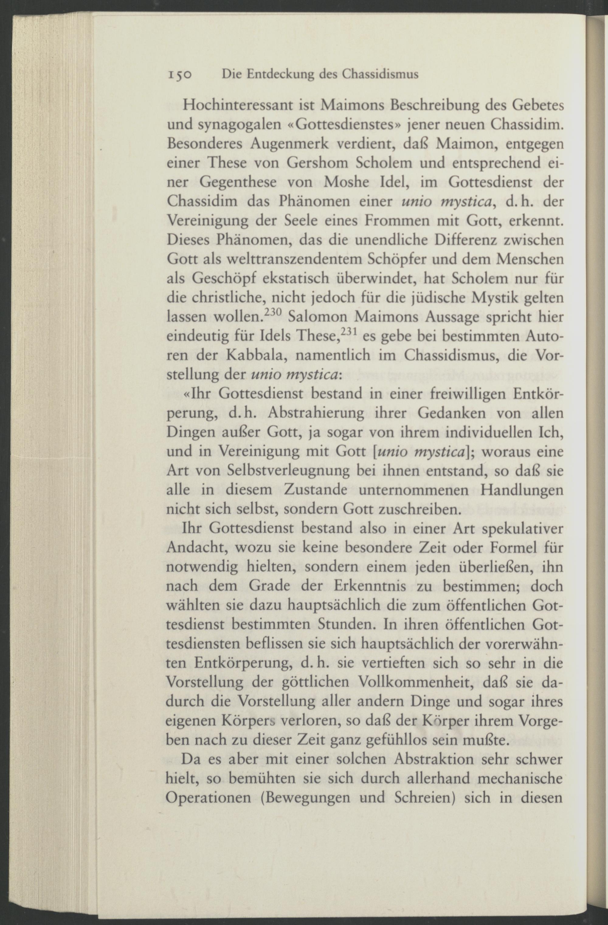 Hochinteressant ist Maimons Beschreibung des Gebetes und synagogalen «Gottesdienstes» jener neuen Chassidim. Besonderes Augenmerk verdient, daß Maimon, entgegen einer These von Gershom Scholem und entsprechend einer Gegenthese von Moshe Idel, im Gottesdienst der Chassidim das Phänomen einer uttio mystica, d. h. der Vereinigung der Seele eines Frommen mit Gott, erkennt. Dieses Phänomen, das die unendliche Differenz zwischen Gott als welttranszendentem Schöpfer und dem Menschen als Geschöpf ekstatisch überwindet, hat Scholem nur für die christliche, nicht jedoch für die jüdische Mystik gelten lassen wollen . 230 Salomon Maimons Aussage spricht hier eindeutig für Idels These , 231 es gebe bei bestimmten Autoren der Kabbala, namentlich im Chassidismus, die Vorstellung der unio mystica: