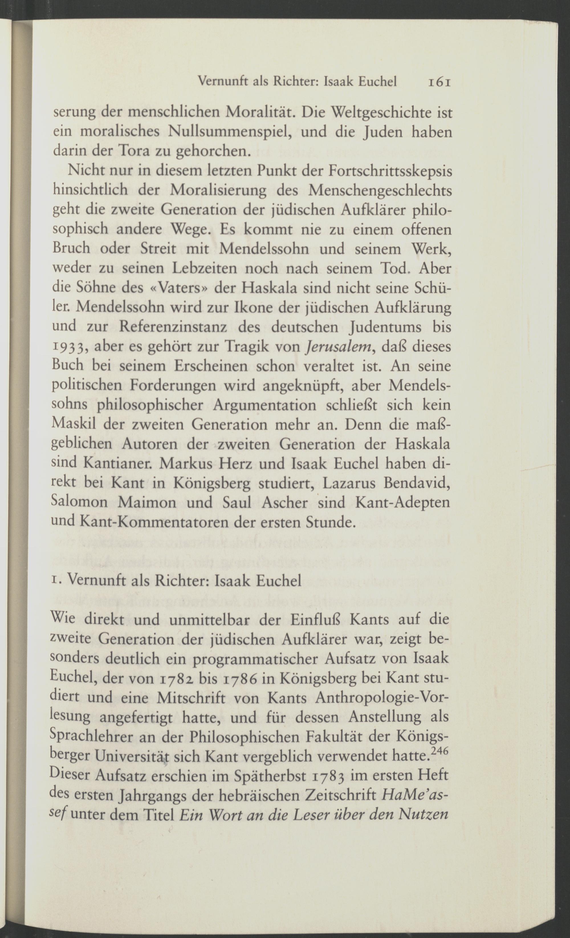 Wie direkt und unmittelbar der Einfluß Kants auf die zweite Generation der jüdischen Aufklärer war, zeigt besonders deutlich ein programmatischer Aufsatz von Isaak Euchel, der von 1782 bis 1786 in Königsberg bei Kant studiert und eine Mitschrift von Kants Anthropologie-Vorlesung angefertigt hatte, und für dessen Anstellung als Sprachlehrer an der Philosophischen Fakultät der Königsberger Universität sich Kant vergeblich verwendet hatte. 246 Dieser Aufsatz erschien im Spätherbst 1783 im ersten Heft des ersten Jahrgangs der hebräischen Zeitschrift HaMe’as- se f unter dem Titel Ein Wort an die Leser über den Nutzen