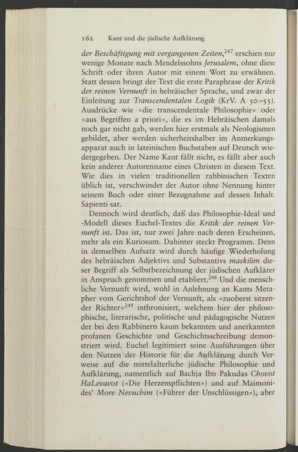 Dennoch wird deutlich, daß das Philosophie-Ideal und -Modell dieses Euchel-Textes die Kritik der reinen Vernunft ist. Das ist, nur zwei Jahre nach deren Erscheinen, mehr als ein Kuriosum. Dahinter steckt Programm. Denn in demselben Aufsatz wird durch häufige Wiederholung des hebräischen Adjektivs und Substantivs maskilim dieser Begriff als Selbstbezeichnung der jüdischen Aufklärer in Anspruch genommen und etabliert. 248 Und die menschliche Vernunft wird, wohl in Anlehnung an Kants Metapher vom Gerichtshof der Vernunft, als «zuoberst sitzender Richter» 249 inthronisiert, welchem hier der philosophische, literarische, politische und pädagogische Nutzen der bei den Rabbinern kaum bekannten und anerkannten profanen Geschichte und Geschichtsschreibung demonstriert wird. Euchel legitimiert seine Ausführungen über den Nutzen der Historie für die Aufklärung durch Verweise auf die mittelalterliche jüdische Philosophie und Aufklärung, namentlich auf Bachja Ibn Pakudas Chovot HaLevavot («Die Herzenspflichten») und auf Maimoni- des’ More Nevuchim («Führer der Unschlüssigen»), aber