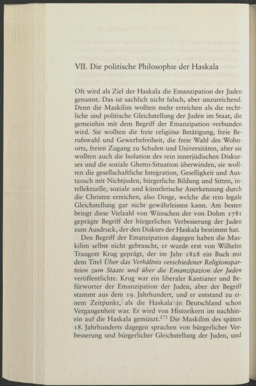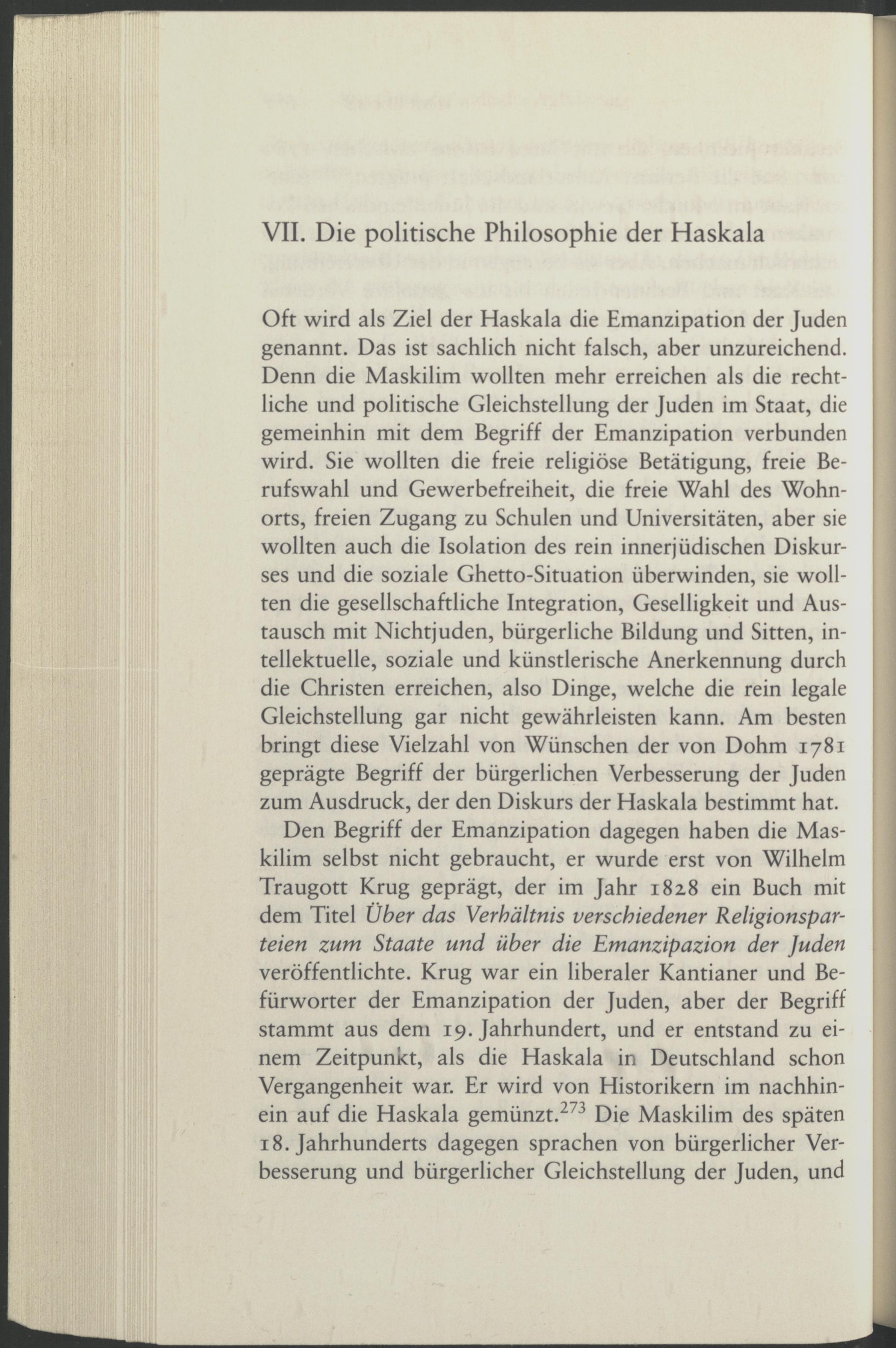 Den Begriff der Emanzipation dagegen haben die Maskilim selbst nicht gebraucht, er wurde erst von Wilhelm Traugott Krug geprägt, der im Jahr 182.8 ein Buch mit dem Titel Über das Verhältnis verschiedener Religionsparteien zum Staate und über die Emanzipazion der Juden veröffentlichte. Krug war ein liberaler Kantianer und Befürworter der Emanzipation der Juden, aber der Begriff stammt aus dem 19. Jahrhundert, und er entstand zu einem Zeitpunkt, als die Haskala in Deutschland schon Vergangenheit war. Er wird von Historikern im nachhinein auf die Haskala gemünzt. 273 Die Maskilim des späten 18. Jahrhunderts dagegen sprachen von bürgerlicher Verbesserung und bürgerlicher Gleichstellung der Juden, und