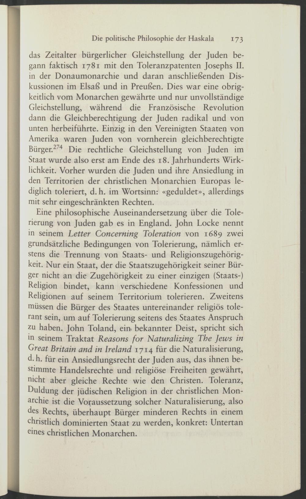 Eine philosophische Auseinandersetzung über die Tolerierung von Juden gab es in England. John Locke nennt in seinem Letter Concerning Toleration von 1689 zwei grundsätzliche Bedingungen von Tolerierung, nämlich erstens die Trennung von Staats- und Religionszugehörigkeit. Nur ein Staat, der die Staatszugehörigkeit seiner Bürger nicht an die Zugehörigkeit zu einer einzigen (Staats-) Religion bindet, kann verschiedene Konfessionen und Religionen auf seinem Territorium tolerieren. Zweitens müssen die Bürger des Staates untereinander religiös tolerant sein, um auf Tolerierung seitens des Staates Anspruch zu haben. John Toland, ein. bekannter Deist, spricht sich in seinem Traktat Reasons for Naturalizing The Jews in Great Britain and in Ireland 1714 für die Naturalisierung, d. h. für ein Ansiedlungsrecht der Juden aus, das ihnen bestimmte Handelsrechte und religiöse Freiheiten gewährt, nicht aber gleiche Rechte wie den Christen. Toleranz, Duldung der jüdischen Religion in der christlichen Monarchie ist die Voraussetzung solcher Naturalisierung, also des Rechts, überhaupt Bürger minderen Rechts in einem christlich dominierten Staat zu werden, konkret: Untertan eines christlichen Monarchen.