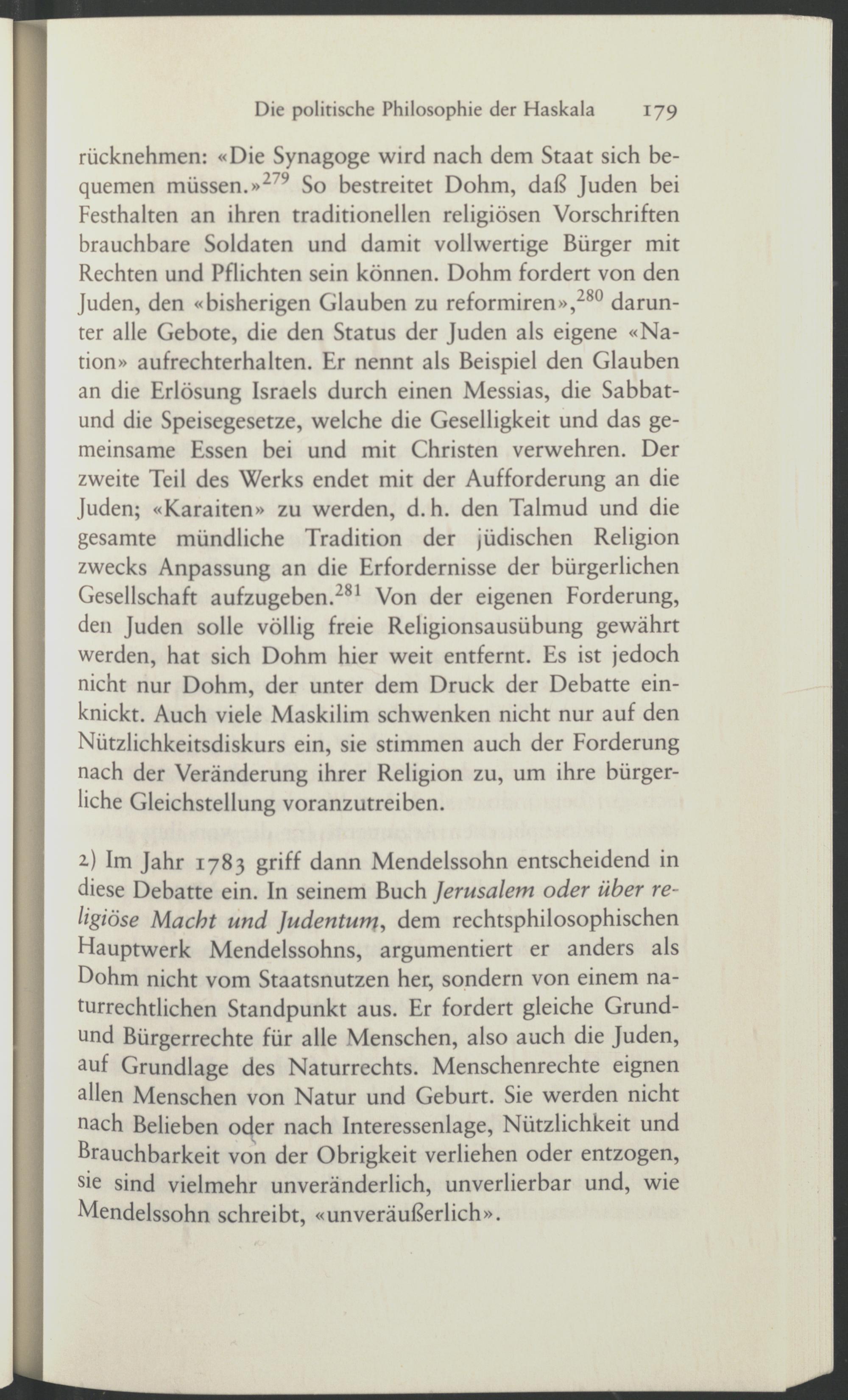 a) Im Jahr 1783 griff dann Mendelssohn entscheidend in diese Debatte ein. In seinem Buch Jerusalem oder über religiöse Macht und Judentum , dem rechtsphilosophischen Hauptwerk Mendelssohns, argumentiert er anders als Dohm nicht vom Staatsnutzen her, sondern von einem naturrechtlichen Standpunkt aus. Er fordert gleiche Gründend Bürgerrechte für alle Menschen, also auch die Juden, auf Grundlage des Naturrechts. Menschenrechte eignen allen Menschen von Natur und Geburt. Sie werden nicht nach Belieben oder nach Interessenlage, Nützlichkeit und Brauchbarkeit von der Obrigkeit verliehen oder entzogen, s *e sind vielmehr unveränderlich, unverlierbar und, wie Mendelssohn schreibt, «unveräußerlich».