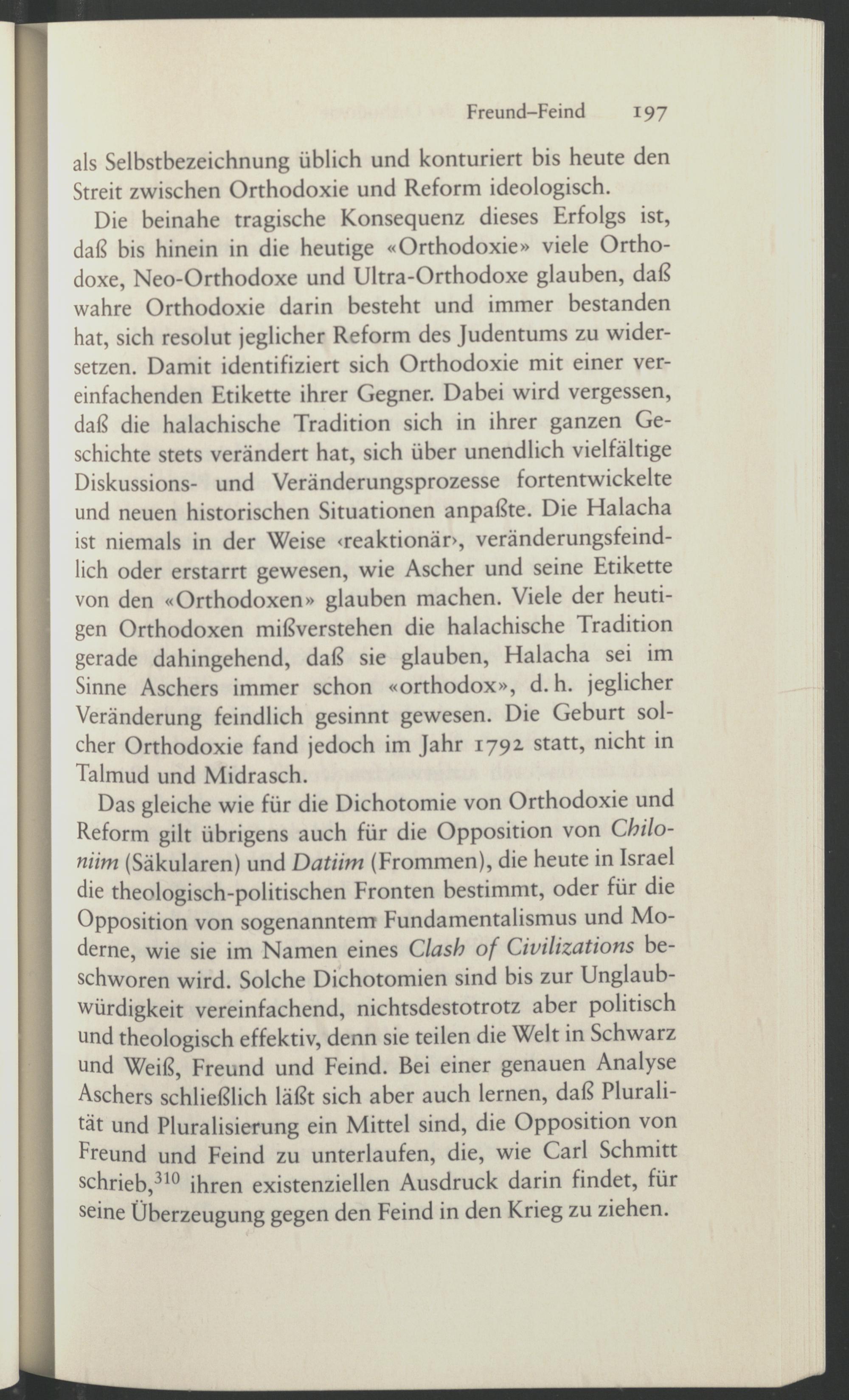 Das gleiche wie für die Dichotomie von Orthodoxie und Reform gilt übrigens auch für die Opposition von Chilo- niim (Säkularen) und Datiim (Frommen), die heute in Israel die theologisch-politischen Fronten bestimmt, oder für die Opposition von sogenanntem Fundamentalismus und Moderne, wie sie im Namen eines Clash of Civilizations beschworen wird. Solche Dichotomien sind bis zur Unglaubwürdigkeit vereinfachend, nichtsdestotrotz aber politisch und theologisch effektiv, denn sie teilen die Welt in Schwarz und Weiß, Freund und Feind. Bei einer genauen Analyse Aschers schließlich läßt sich aber auch lernen, daß Pluralität und Pluralisierung ein Mittel sind, die Opposition von Freund und Feind zu unterlaufen, die, wie Carl Schmitt schrieb, 310 ihren existenziellen Ausdruck darin findet, für seine Überzeugung gegen den Feind in den Krieg zu ziehen.