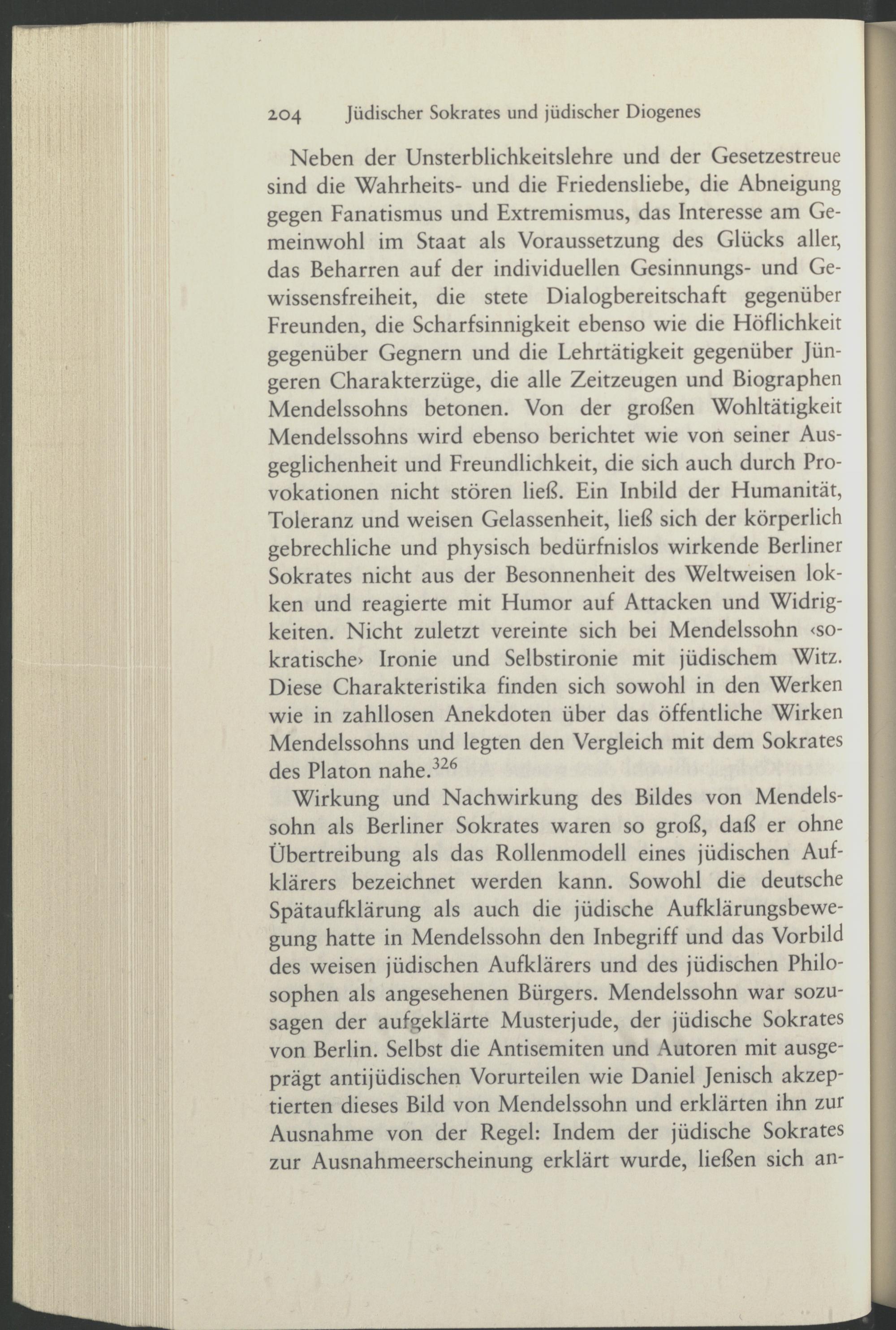 Neben der Unsterblichkeitslehre und der Gesetzestreue sind die Wahrheits- und die Friedensliebe, die Abneigung gegen Fanatismus und Extremismus, das Interesse am Gemeinwohl im Staat als Voraussetzung des Glücks aller, das Beharren auf der individuellen Gesinnungs- und Gewissensfreiheit, die stete Dialogbereitschaft gegenüber Freunden, die Scharfsinnigkeit ebenso wie die Höflichkeit gegenüber Gegnern und die Lehrtätigkeit gegenüber Jüngeren Charakterzüge, die alle Zeitzeugen und Biographen Mendelssohns betonen. Von der großen Wohltätigkeit Mendelssohns wird ebenso berichtet wie von seiner Ausgeglichenheit und Freundlichkeit, die sich auch durch Provokationen nicht stören ließ. Ein Inbild der Humanität, Toleranz und weisen Gelassenheit, ließ sich der körperlich gebrechliche und physisch bedürfnislos wirkende Berliner Sokrates nicht aus der Besonnenheit des Weltweisen lok- ken und reagierte mit Humor auf Attacken und Widrigkeiten. Nicht zuletzt vereinte sich bei Mendelssohn <so- kratische> Ironie und Selbstironie mit jüdischem Witz. Diese Charakteristika finden sich sowohl in den Werken wie in zahllosen Anekdoten über das öffentliche Wirken Mendelssohns und legten den Vergleich mit dem Sokrates des Platon nahe . 326