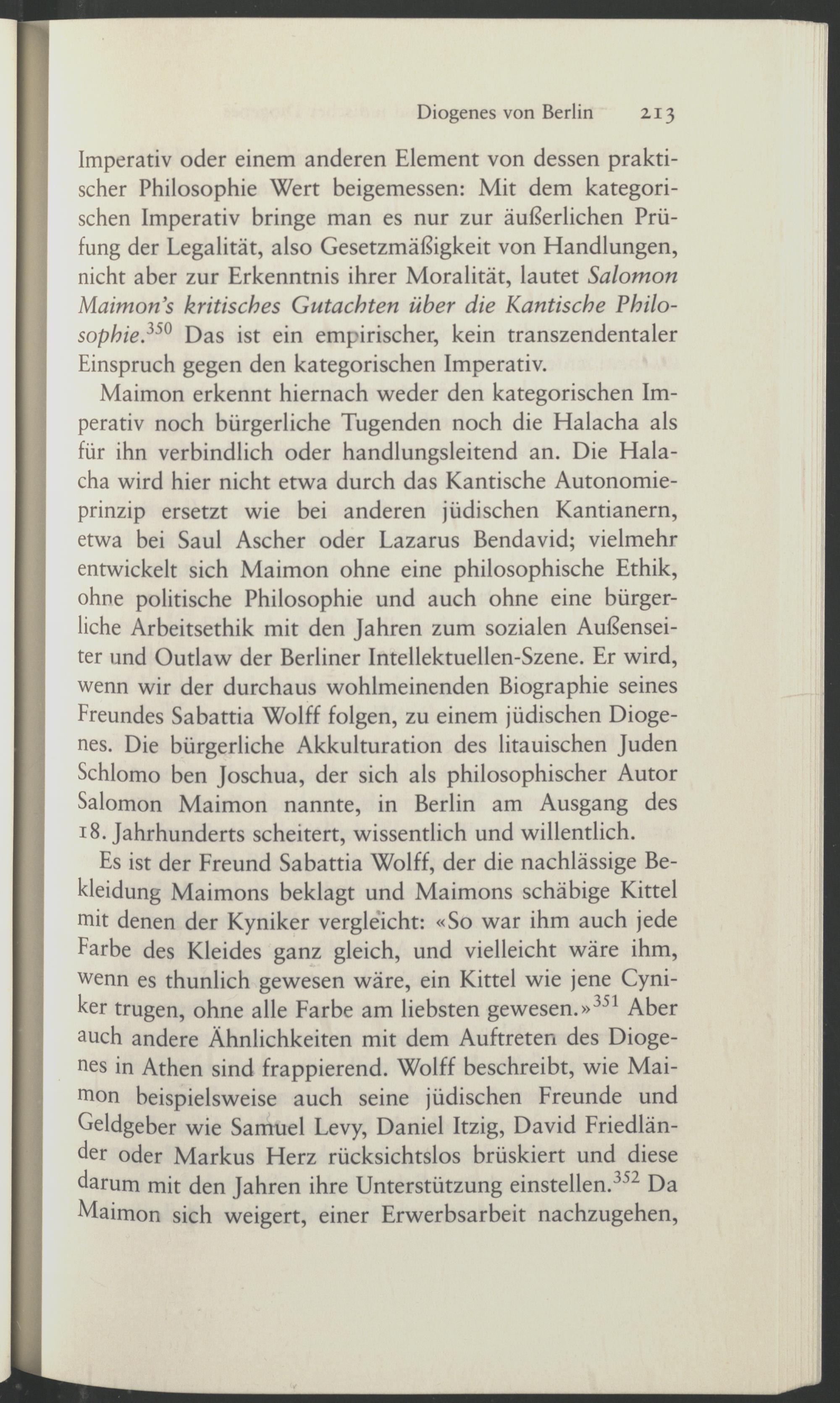 Es ist der Freund Sabattia Wolff, der die nachlässige Bekleidung Maimons beklagt und Maimons schäbige Kittel mit denen der Kyniker vergleicht: «So war ihm auch jede Farbe des Kleides ganz gleich, und vielleicht wäre ihm, wenn es thunlich gewesen wäre, ein Kittel wie jene Cyni- ker trugen, ohne alle Farbe am liebsten gewesen.» 351 Aber auch andere Ähnlichkeiten mit dem Auftreten des Diogenes in Athen sind frappierend. Wolff beschreibt, wie Maimon beispielsweise auch seine jüdischen Freunde und Geldgeber wie Samuel Levy, Daniel Itzig, David Friedländer oder Markus Herz rücksichtslos brüskiert und diese darum mit den Jahren ihre Unterstützung einstellen. 352 Da Maimon sich weigert, einer Erwerbsarbeit nachzugehen,