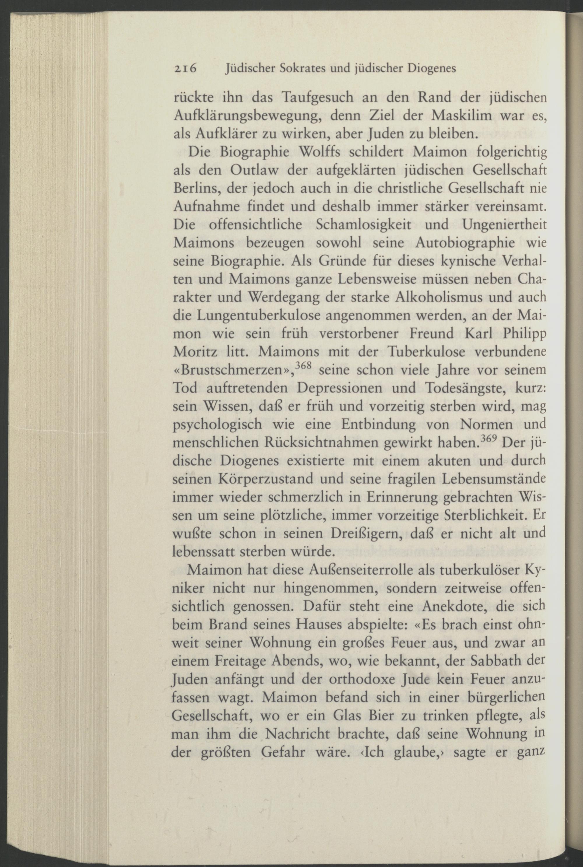 Die Biographie Wolffs schildert Maimon folgerichtig als den Outlaw der aufgeklärten jüdischen Gesellschaft Berlins, der jedoch auch in die christliche Gesellschaft nie Aufnahme findet und deshalb immer stärker vereinsamt. Die offensichtliche Schamlosigkeit und Ungeniertheit Maimons bezeugen sowohl seine Autobiographie wie seine Biographie. Als Gründe für dieses kynische Verhalten und Maimons ganze Lebensweise müssen neben Charakter und Werdegang der starke Alkoholismus und auch die Lungentuberkulose angenommen werden, an der Maimon wie sein früh verstorbener Freund Karl Philipp Moritz litt. Maimons mit der Tuberkulose verbundene «Brustschmerzen », 368 seine schon viele Jahre vor seinem Tod auftretenden Depressionen und Todesängste, kurz: sein Wissen, daß er früh und vorzeitig sterben wird, mag psychologisch wie eine Entbindung von Normen und menschlichen Rücksichtnahmen gewirkt haben . 369 Der jüdische Diogenes existierte mit einem akuten und durch seinen Körperzustand und seine fragilen Lebensumstände immer wieder schmerzlich in Erinnerung gebrachten Wissen um seine plötzliche, immer vorzeitige Sterblichkeit. Er wußte schon in seinen Dreißigern, daß er nicht alt und lebenssatt sterben würde.