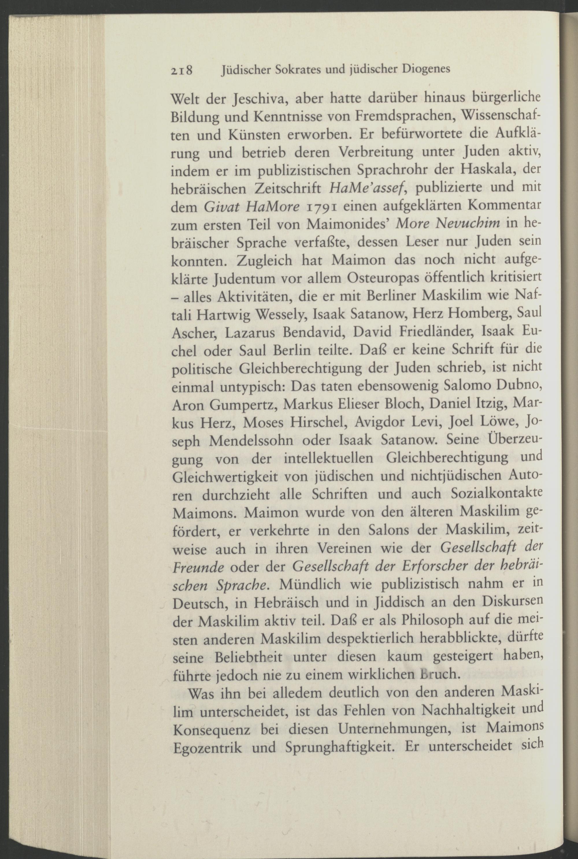 Welt der Jeschiva, aber hatte darüber hinaus bürgerliche Bildung und Kenntnisse von Fremdsprachen, Wissenschaften und Künsten erworben. Er befürwortete die Aufklärung und betrieb deren Verbreitung unter Juden aktiv, indem er im publizistischen Sprachrohr der Haskala, der hebräischen Zeitschrift HaMe’assef, publizierte und mit dem Givat HaMore 1791 einen aufgeklärten Kommentar zum ersten Teil von Maimonides’ More Nevuchim in hebräischer Sprache verfaßte, dessen Leser nur Juden sein konnten. Zugleich hat Maimon das noch nicht aufgeklärte Judentum vor allem Osteuropas öffentlich kritisiert - alles Aktivitäten, die er mit Berliner Maskilim wie Naf- tali Hartwig Wessely, Isaak Satanow, Herz Homberg, Saul Ascher, Lazarus Bendavid, David Friedländer, Isaak Eu- chel oder Saul Berlin teilte. Daß er keine Schrift für die politische Gleichberechtigung der Juden schrieb, ist nicht einmal untypisch: Das taten ebensowenig Salomo Dubno, Aron Gumpertz, Markus Elieser Bloch, Daniel Itzig, Markus Herz, Moses Hirschei, Avigdor Levi, Joel Löwe, Joseph Mendelssohn oder Isaak Satanow. Seine Überzeugung von der intellektuellen Gleichberechtigung und Gleichwertigkeit von jüdischen und nicht jüdischen Autoren durchzieht alle Schriften und auch Sozialkontakte Maimons. Maimon wurde von den älteren Maskilim gefördert, er verkehrte in den Salons der Maskilim, zeitweise auch in ihren Vereinen wie der Gesellschaft der Freunde oder der Gesellschaft der Erforscher der hebräischen Sprache. Mündlich wie publizistisch nahm er in Deutsch, in Hebräisch und in Jiddisch an den Diskursen der Maskilim aktiv teil. Daß er als Philosoph auf die meisten anderen Maskilim despektierlich herabblickte, dürfte seine Beliebtheit unter diesen kaum gesteigert haben, führte jedoch nie zu einem wirklichen Bruch.