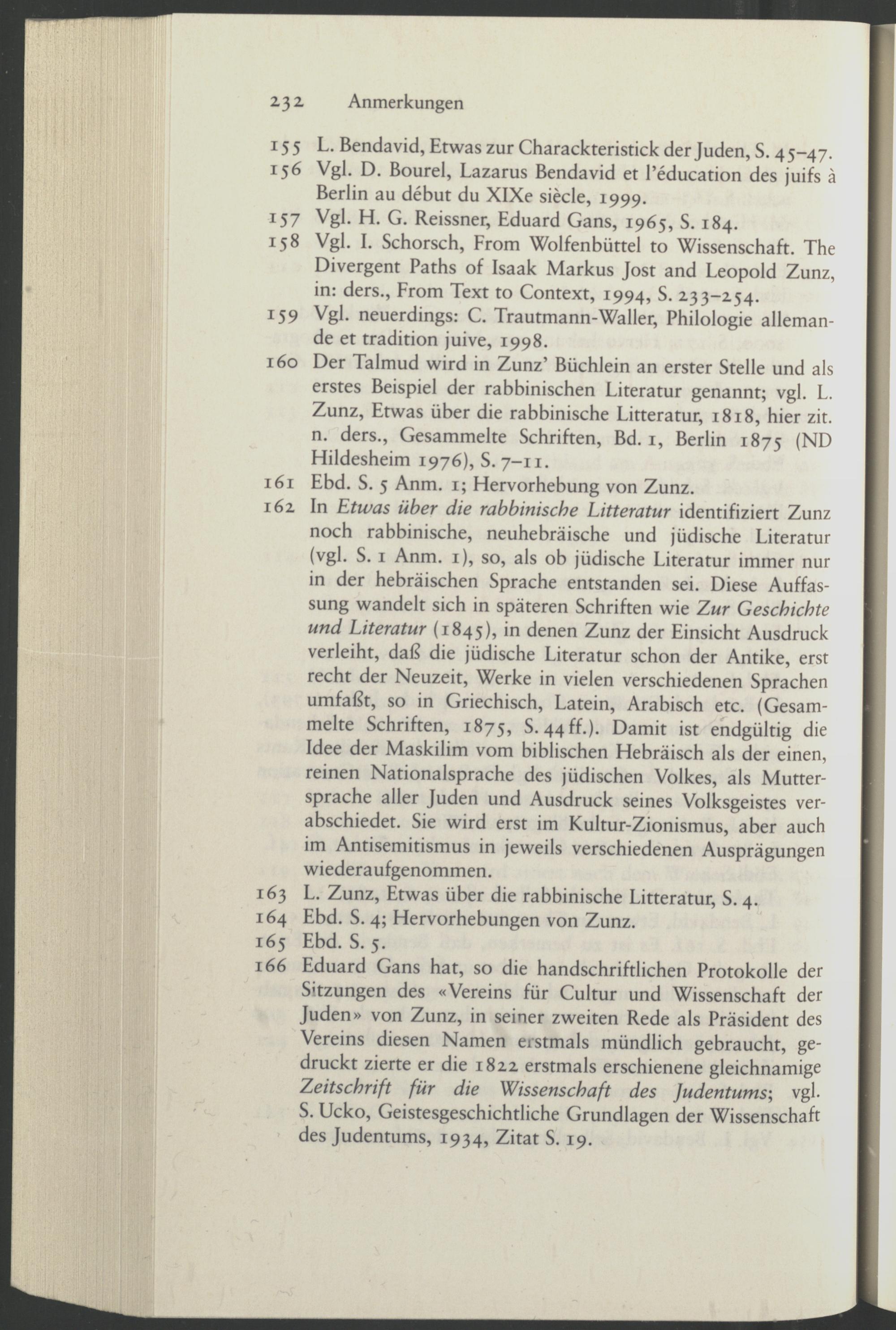 160 Der Talmud wird in Zunz’ Büchlein an erster Stelle und als erstes Beispiel der rabbinischen Literatur genannt; vgl. L. Zunz, Etwas über die rabbinische Litteratur, 1818, hier zit. n. ders., Gesammelte Schriften, Bd. 1, Berlin 1875 (ND Hildesheim 1976), S. 7-11.
