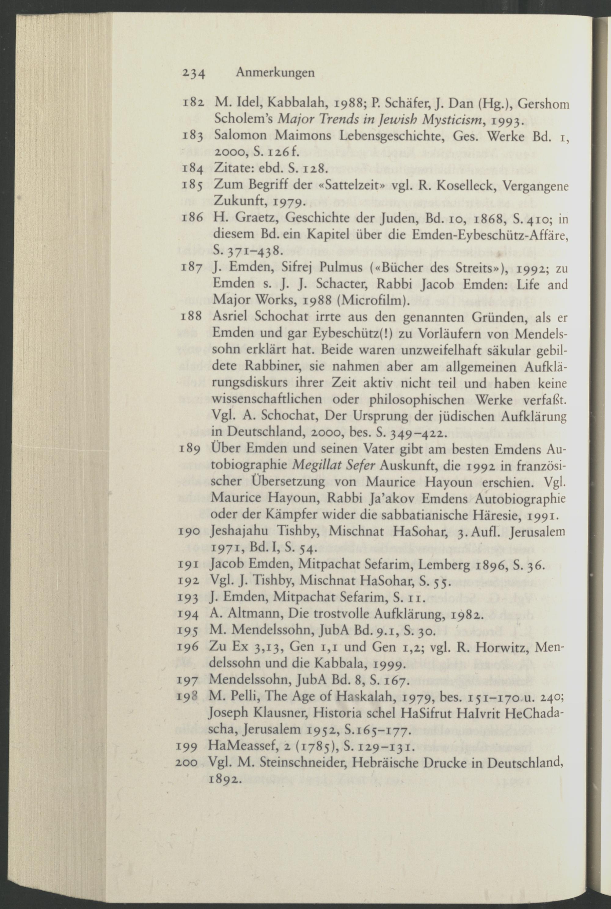 188 Asriel Schochat irrte aus den genannten Gründen, als er Emden und gar Eybeschütz(!) zu Vorläufern von Mendelssohn erklärt hat. Beide waren unzweifelhaft säkular gebildete Rabbiner, sie nahmen aber am allgemeinen Aufklärungsdiskurs ihrer Zeit aktiv nicht teil und haben keine wissenschaftlichen oder philosophischen Werke verfaßt. Vgl. A. Schochat, Der Ursprung der jüdischen Aufklärung in Deutschland, 2000, bes. S. 349-422.