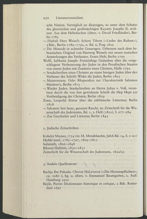(Naftali Herz Weisel): Schirej Tiferet («Lieder des Ruhms»), 5ßde., Berlin 1789-1792, u. Bd. 6, Prag 1829 Die Moseide in achtzehn Gesaengen. Uebersezt nach dem he- braeischen Original von Hartwig Wessely mit neuen teutschen Anmerkungen des Verfassers. Erstes Heft, Berlin 1795 Wolff, Sabbatia Joseph: Freimüthige Gedanken über die vorgeschlagene Verbesserung der Juden in den Preußischen Staaten von einem Juden mit Zusätzen eines Christen, Halle 1792 -: Sendschreiben eines Christen an einen hiesigen Juden über den Verfasser der Schrift: Wider die Juden, Berlin 1803 -: Maimoniana. Oder Rhapsodien zur Charakteristik Salomon Maimon’s, Berlin 1813