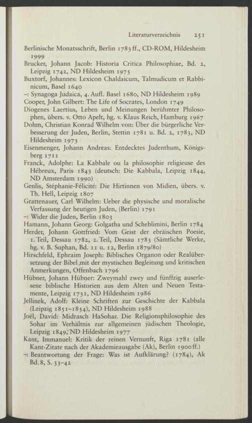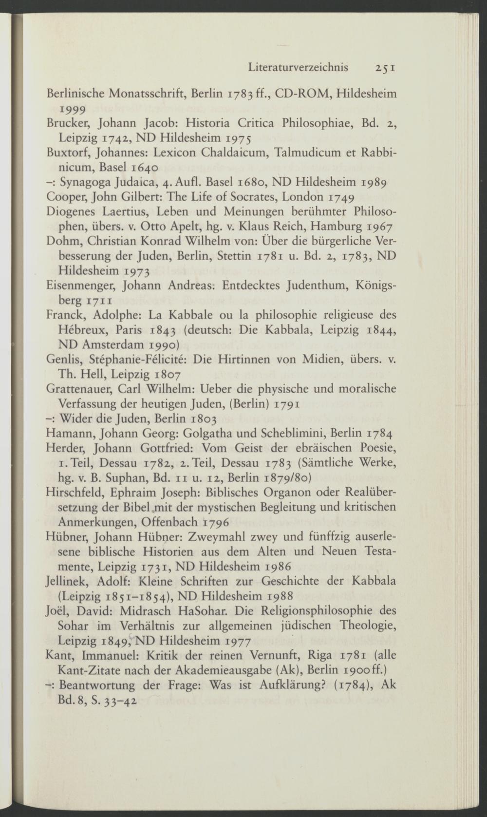 Hübner, Johann Hübner: Zweymahl zwey und fünffzig auserlesene biblische Historien aus dem Alten und Neuen Testamente, Leipzig 1731, ND Hildesheim 1986 Jellinek, Adolf: Kleine Schriften zur Geschichte der Kabbala (Leipzig 1851-1854), ND Hildesheim 1988 Joel, David: Midrasch HaSohar. Die Religionsphilosophie des Sohar im Verhältnis zur allgemeinen jüdischen Theologie, Leipzig 1849,'ND Hildesheim 1977 Kant, Immanuel: Kritik der reinen Vernunft, Riga 1781 (alle Kant-Zitate nach der Akademieausgabe (Ak), Berlin 1900 ff.)