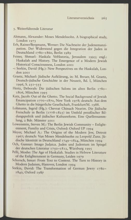 Lowenstein, Steven M.: The Berlin Jewish Community - Enlight- enment, Familiy and Crisis, Oxford: Oxford UP 1994 Meyer, Michael A.: The Origins of the Modern Jew, Detroit 1967; deutsch: Vpn Moses Mendelssohn zu Leopold Zunz. Jüdische Identität in Deutschland 1749-1824, München 1994 Och, Gunnar: Imago Judaica. Juden und Judentum im Spiegel der deutschen Literatur 1750-1812, Würzburg 1995 Pelli, Moshe: The Age of Haskalah. Studies in Hebrew Literature of the Enlightenment in Germany, Leiden 1979 Schorsch, Ismar: From Text to Context. The Turn to History in Modern Judaism, Hanover, London 1994 Sorkin, David: The Transformation of German Jewry 1780- 1840, Oxford 198,7