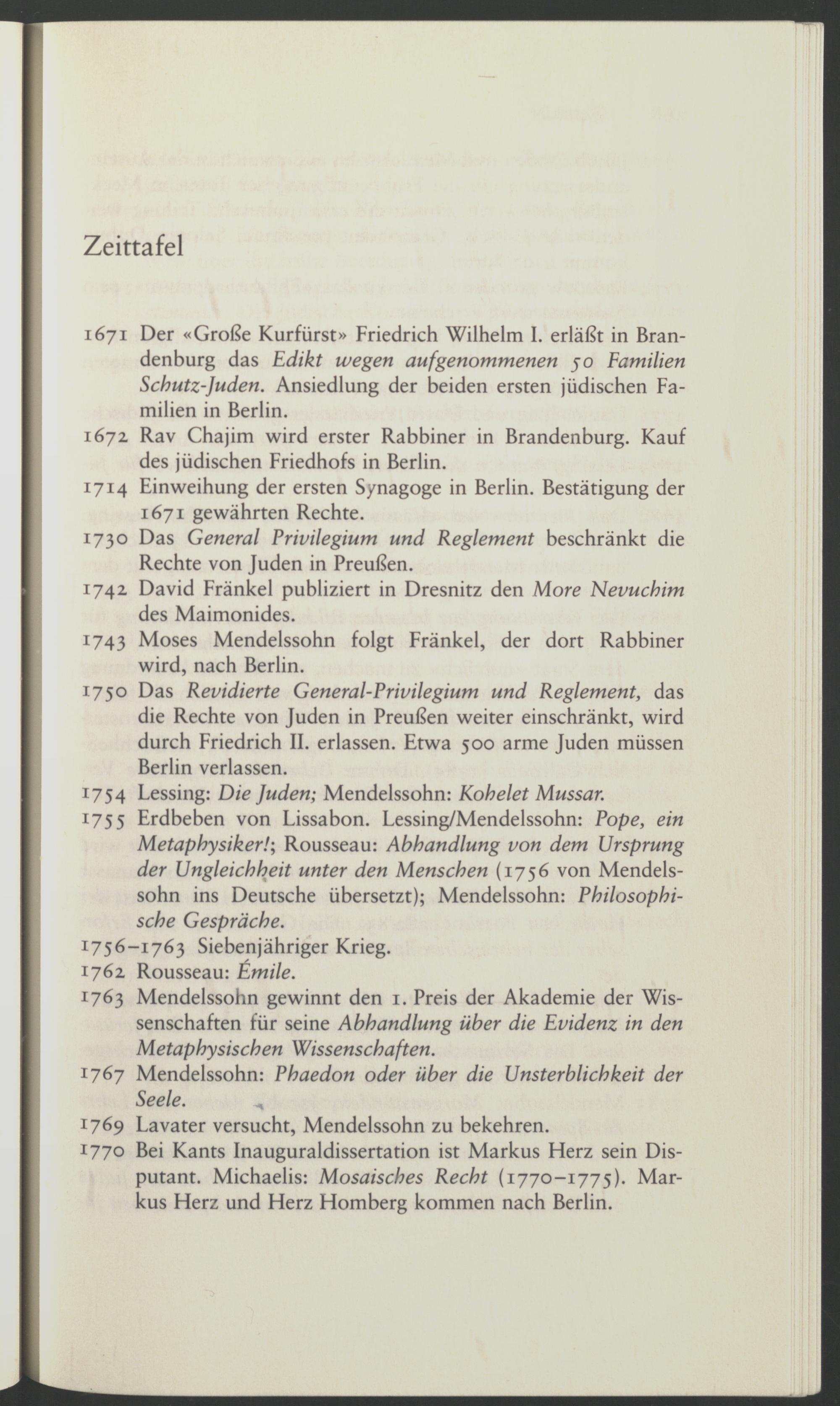1763 Mendelssohn gewinnt den 1. Preis der Akademie der Wissenschaften für seine Abhandlung über die Evidenz in den Metaphysischen Wissenschaften.