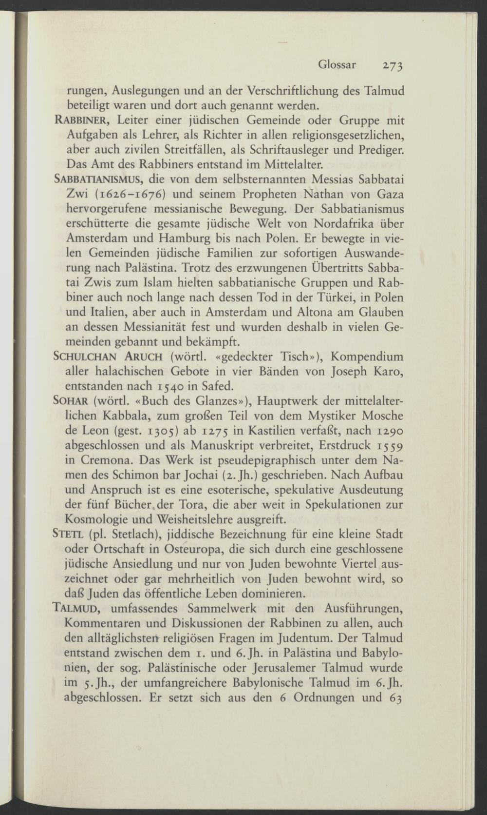 Sabbatianismus, die von dem selbsternannten Messias Sabbatai Zwi (1626-1676) und seinem Propheten Nathan von Gaza hervorgerufene messianische Bewegung. Der Sabbatianismus erschütterte die gesamte jüdische Welt von Nordafrika über Amsterdam und Hamburg bis nach Polen. Er bewegte in vielen Gemeinden jüdische Familien zur sofortigen Auswanderung nach Palästina. Trotz des erzwungenen Übertritts Sabbatai Zwis zum Islam hielten sabbatianische Gruppen und Rabbiner auch noch lange nach dessen Tod in der Türkei, in Polen und Italien, aber auch in Amsterdam und Altona am Glauben an dessen Messianität fest und wurden deshalb in vielen Gemeinden gebannt und bekämpft.