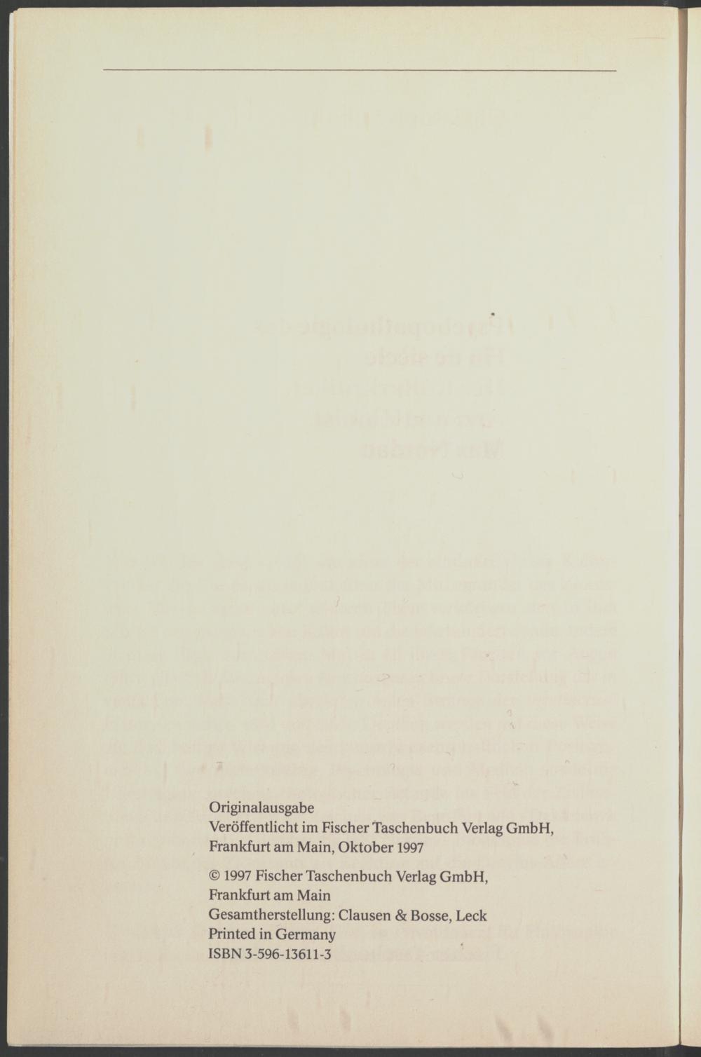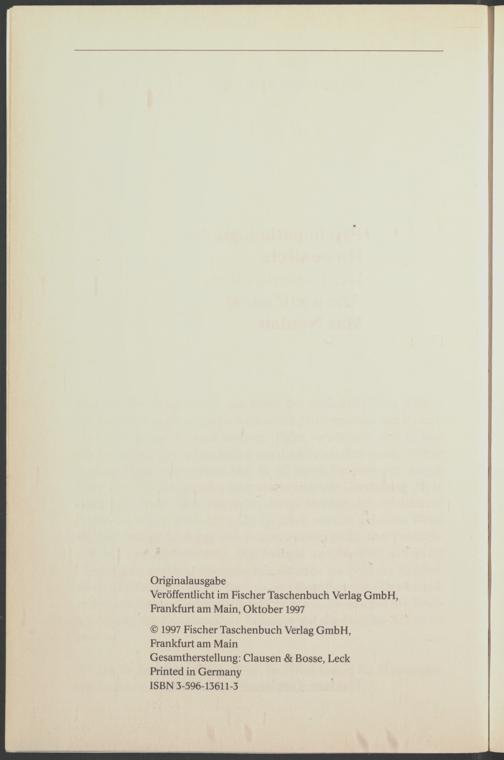 Originalausgabe Veröffentlicht im Fischer Taschenbuch Verlag GmbH , Frankfurt am Main , Oktober 1997 © 1997 Fischer Taschenbuch Verlag GmbH , Frankfurt am Main Gesamtherstellung: Clausen & Bosse, Leck Printed in Germany ISBN 3-596-13611-3