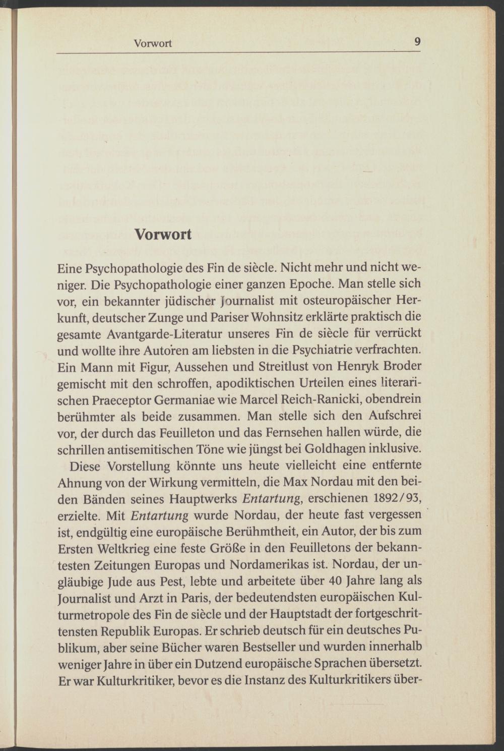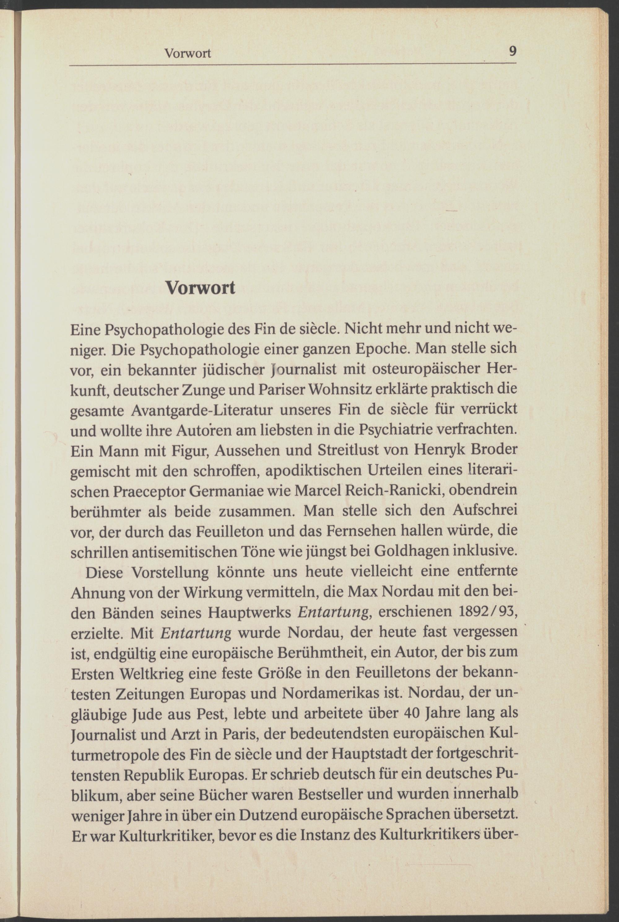 Eine Psychopathologie des Fin de siècle . Nicht mehr und nicht weniger. Die Psychopathologie einer ganzen Epoche. Man stelle sich vor, ein bekannter jüdischer Journalist mit osteuropäischer Herkunft, deutscher Zunge und Pariser Wohnsitz erklärte praktisch die gesamte Avantgarde-Literatur unseres Fin de siede für verrückt und wollte ihre Autoren am liebsten in die Psychiatrie verfrachten. Ein Mann mit Figur, Aussehen und Streitlust von Henryk Broder gemischt mit den schroffen, apodiktischen Urteilen eines literarischen Praeceptor Germaniae wie Marcel Reich-Ranicki , obendrein berühmter als beide zusammen. Man stelle sich den Aufschrei vor, der durch das Feuilleton und das Fernsehen hallen würde, die schrillen antisemitischen Töne wie jüngst bei Goldhagen inklusive.