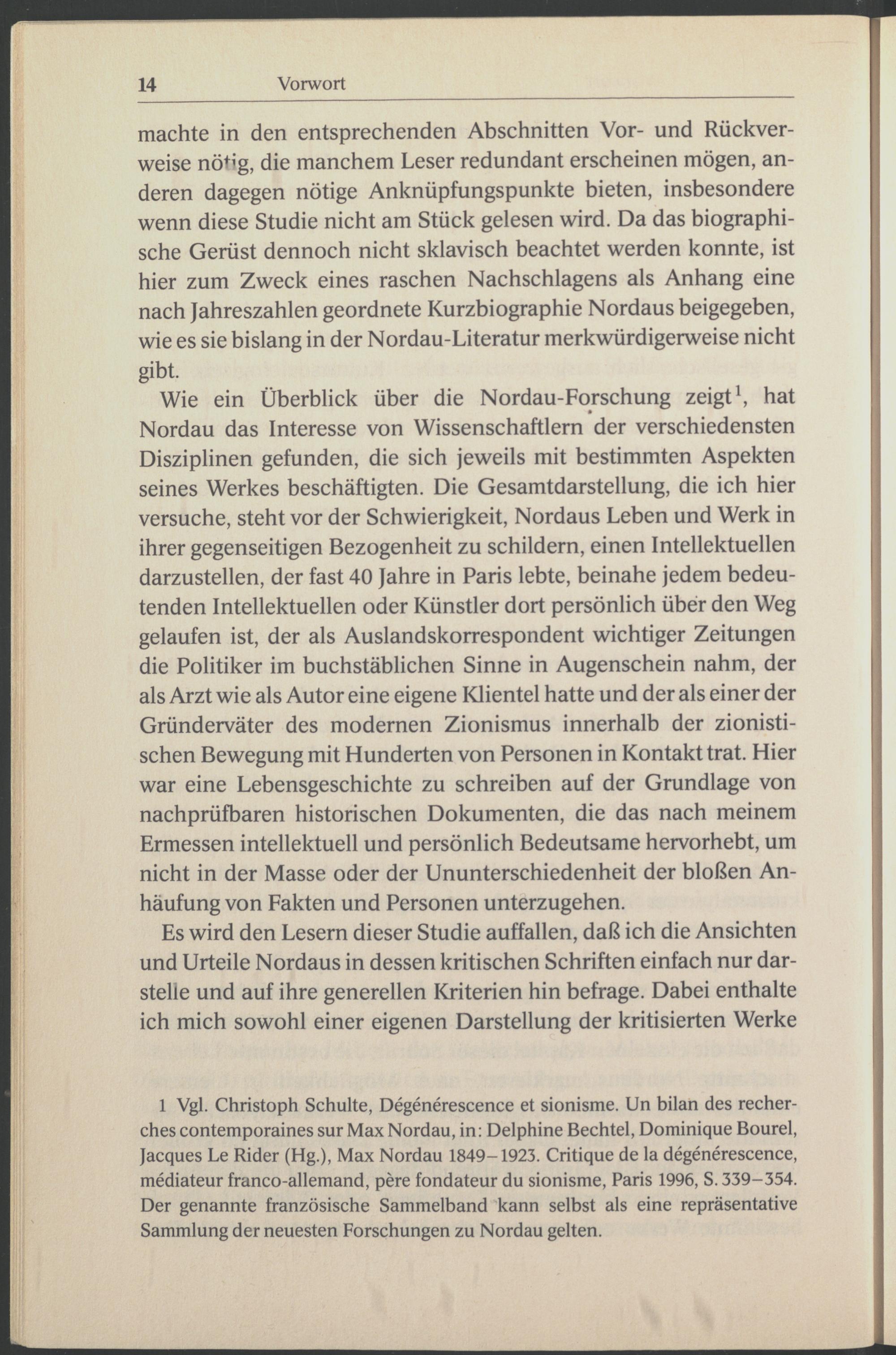 1 Vgl. Christoph Schulte , Degenerescence et sionisme. Un bilan des recher- ches contemporaines sur Max Nordau , in: Delphine Bechtel, Dominique Bourel , Jacques Le Rider (Hg.), Max Nordau 1849-1923. Critique de la dégénérescence, médiateur franco-allemand, pere fondateur du sionisme, Paris 1996, S. 339-354. Der genannte französische Sammelband kann selbst als eine repräsentative Sammlung der neuesten Forschungen zu Nordau gelten.