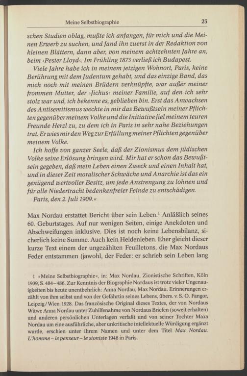 1 »Meine Selbstbiographie«, in: Max Nordau , Zionistische Schriften, Köln 1909, S. 484-486. Zur Kenntnis der Biographie Nordaus ist trotz vieler Ungenauigkeiten bis heute unentbehrlich: Anna Nordau, Max Nordau . Erinnerungen erzählt von ihm selbst und von der Gefährtin seines Lebens, übers, v. S. O. Fangor, Leipzig/Wien 1928. Das französische Original dieses Textes, der von Nordaus Witwe Anna Nordau unter Zuhilfenahme von Nordaus Briefen (soweit erhalten) und anderen persönlichen Unterlagen verfaßt und von seiner Tochter Maxa Nordau um eine ausführliche, aber unkritische intellektuelle Würdigung ergänzt wurde, erschien unter ihrem Namen und unter dem Titel Max Nordau . L’homme-le penseur-le sioniste 1948 in Paris .