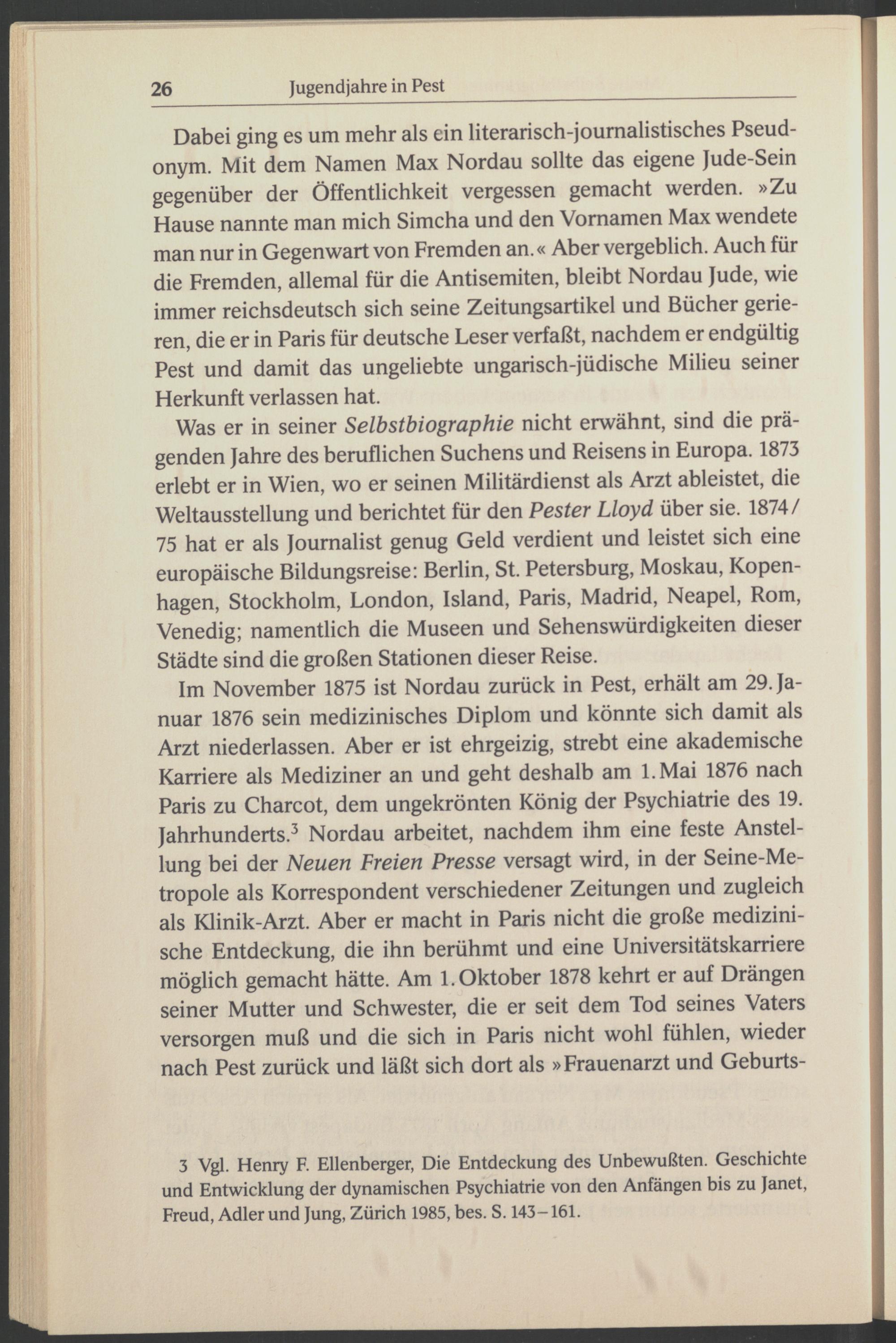 Im November 1875 ist Nordau zurück in Pest , erhält am 29. Januar 1876 sein medizinisches Diplom und könnte sich damit als Arzt niederlassen. Aber er ist ehrgeizig, strebt eine akademische Karriere als Mediziner an und geht deshalb am l.Mai 1876 nach Paris zu Charcot, dem ungekrönten König der Psychiatrie des 19. Jahrhunderts. 3 Nordau arbeitet, nachdem ihm eine feste Anstellung bei der Neuen Freien Presse versagt wird, in der Seine-Metropole als Korrespondent verschiedener Zeitungen und zugleich als Klinik-Arzt. Aber er macht in Paris nicht die große medizinische Entdeckung, die ihn berühmt und eine Universitätskarriere möglich gemacht hätte. Am 1. Oktober 1878 kehrt er auf Drängen seiner Mutter und Schwester, die er seit dem Tod seines Vaters versorgen muß und die sich in Paris nicht wohl fühlen, wieder nach Pest zurück und läßt sich dort als »Frauenarzt und Geburts-