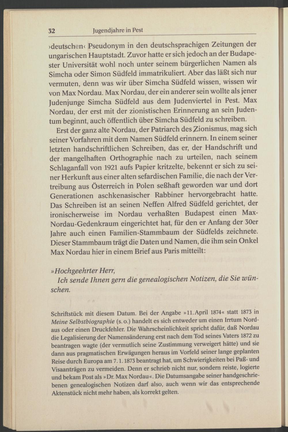 Schriftstück mit diesem Datum. Bei der Angabe »11. April 1874« statt 1873 in Meine Selbstbiographie (s. o.) handelt es sich entweder um einen Irrtum Nord- aus oder einen Druckfehler. Die Wahrscheinlichkeit spricht dafür, daß Nordau die Legalisierung der Namensänderung erst nach dem Tod seines Vaters 1872 zu beantragen wagte (der vermutlich seine Zustimmung verweigert hätte) und sie dann aus pragmatischen Erwägungen heraus im Vorfeld seiner lange geplanten Reise durch Europa am 7.1.1873 beantragt hat, um Schwierigkeiten bei Paß- und Visaanträgen zu vermeiden. Denn er schrieb nicht nur, sondern reiste, logierte und bekam Post als »Dr. Max Nordau «. Die Datumsangabe seiner handgeschriebenen genealogischen Notizen darf also, auch wenn wir das entsprechende Aktenstück nicht mehr haben, als korrekt gelten.