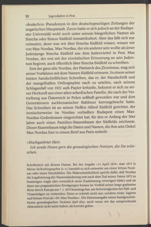 >deutschon< Pseudonym in den deutschsprachigen Zeitungen der ungarischen Hauptstadt. Zuvor hatte er sich jedoch an der Budape- ster Universität wohl noch unter seinem bürgerlichen Namen als Simcha oder Simon Südfeld immatrikuliert. Aber das läßt sich nur vermuten, denn was wir über Simcha Südfeld wissen, wissen wir von Max Nordau . Max Nordau , der ein anderer sein wollte als jener Judenjunge Simcha Südfeld aus dem Judenviertel in Pest . Max Nordau , der erst mit der zionistischen Erinnerung an sein Judentum beginnt, auch öffentlich über Simcha Südfeld zu schreiben.