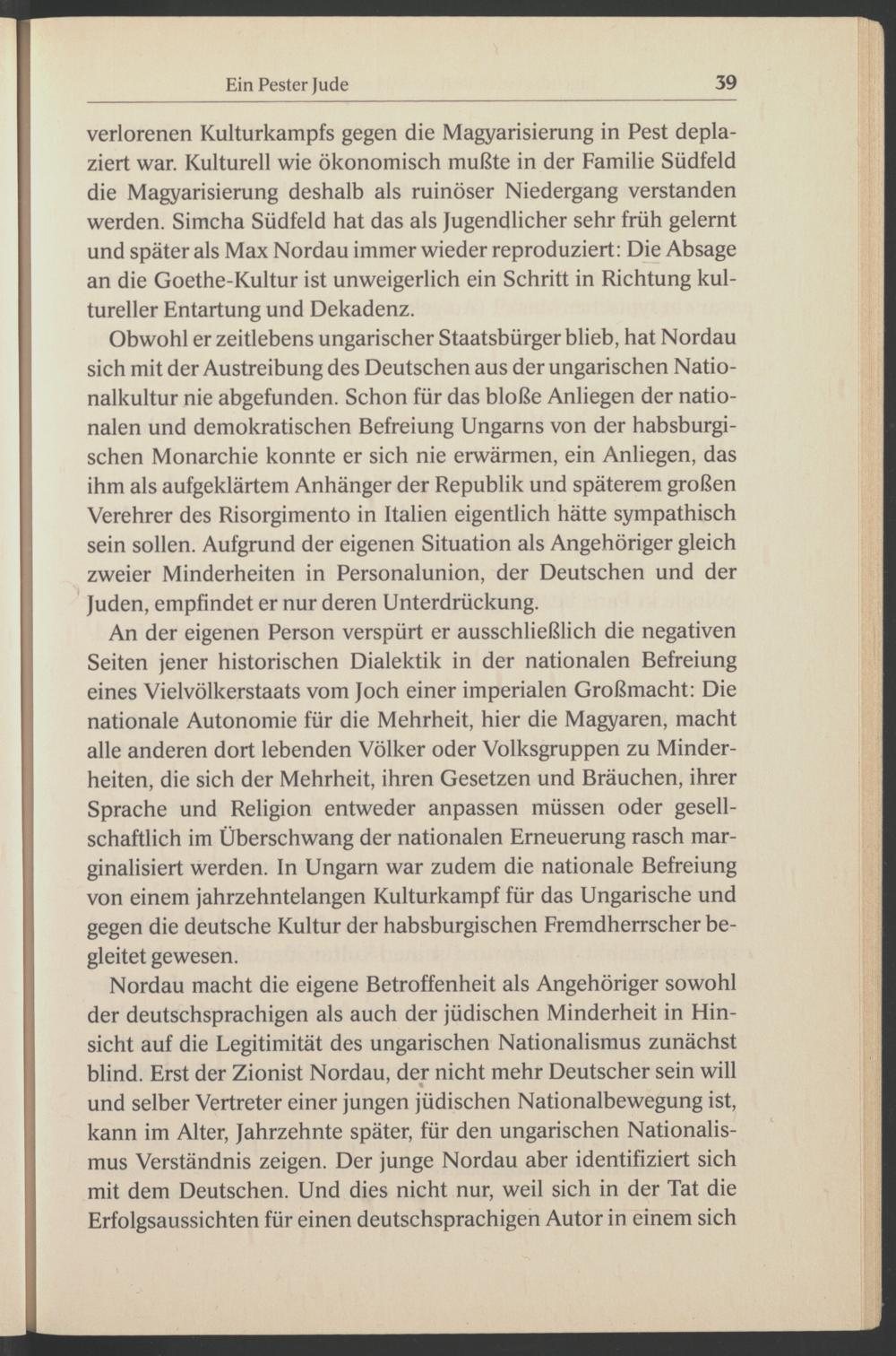 verlorenen Kulturkampfs gegen die Magyarisierung in Pest deplaziert war. Kulturell wie ökonomisch mußte in der Familie Südfeld die Magyarisierung deshalb als ruinöser Niedergang verstanden werden. Simcha Südfeld hat das als Jugendlicher sehr früh gelernt und später als Max Nordau immer wieder reproduziert: Die Absage an die Goethe-Kultur ist unweigerlich ein Schritt in Richtung kultureller Entartung und Dekadenz.