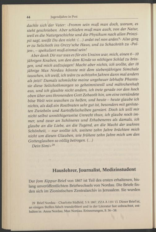 Aberdenk Dir nur was es für ein Unsinn war, mich, einen 6-10 jährigen Knaben, um den dem Kinde so nöthigen Schlaf zu bringen, und mich aufzujagen! Macht aber nichts, ich wollte, der 18 jährige Max Nordau könnte mit dem siebenjährigen Simchale tauschen, ich weiß, ich wäre zu achtzehn Jahren dann mal anders als jetzt! Damals schmückte meine ungeheuer lebhafte Phantasie diese Selichothmorgen so geheimnisvoll und mährchenhaft aus, und ich glaubte nicht anders, ich trete gerade vor den hoch oben über uns thronenden Gott Zebaoth hin, um eine versündete böse Welt rein waschen zu helfen, und heute - heute glaube ich nichts, als daß ein Rostbraten sehr gut ist, besonders mit gerösteten Zwiebeln und Kartoffelscheiben garniert. Doch ich will mir nicht selbst unnöthigerweise Unrecht thun, ich glaube noch immer, und zwar an Schöneres und Erhabeneres als damals, ich glaube an die Liebe, an die Tugend, an die Macht der wahren Schönheit, — nur wollte ich, weitere zehn Jahre brächten mich nicht um diesen Glauben, wie frühere zehn fahre mich um den Gottesglauben so völlig betrogen. (...)