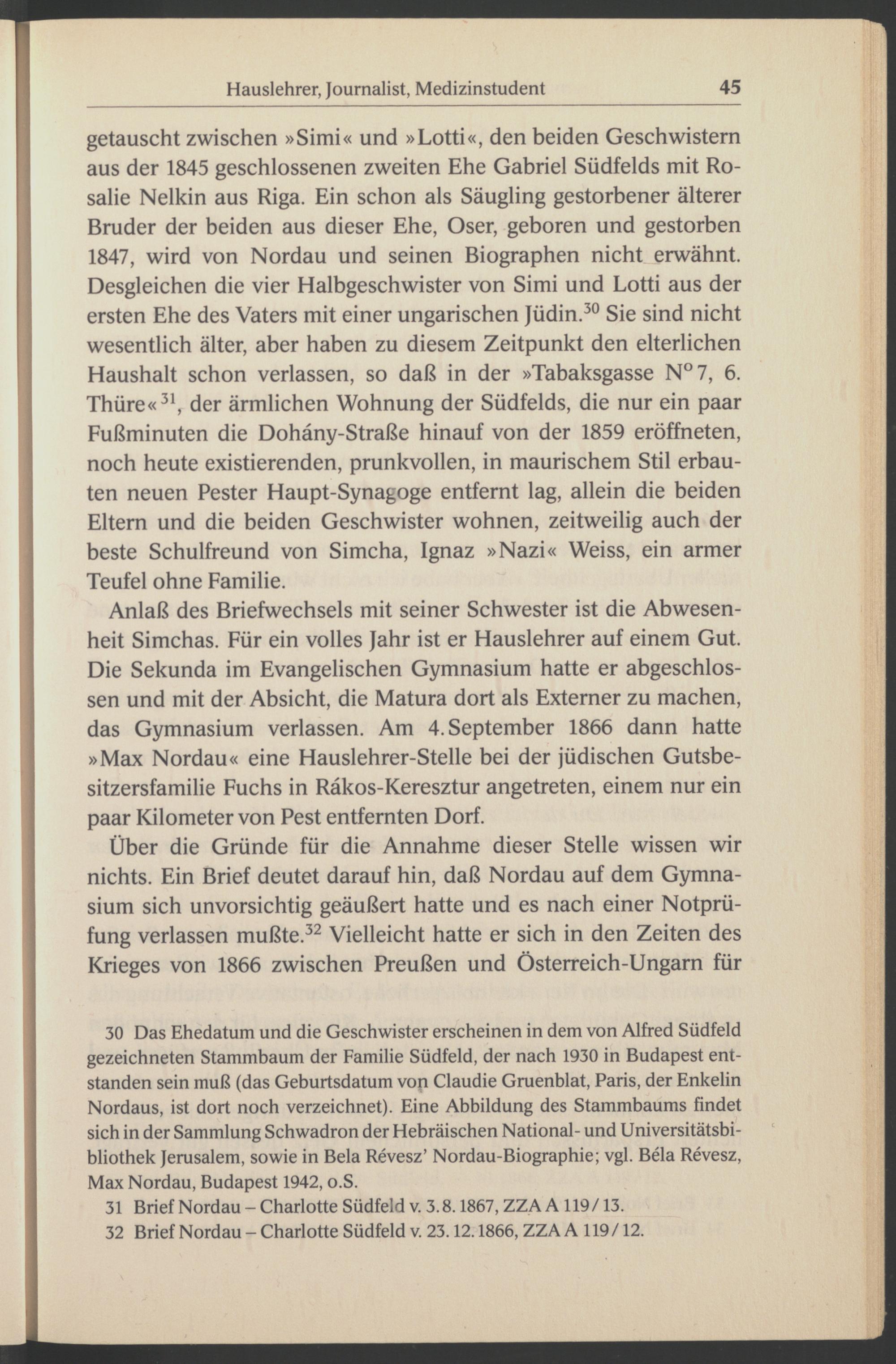 getauscht zwischen »Simi« und »Lotti«, den beiden Geschwistern aus der 1845 geschlossenen zweiten Ehe Gabriel Südfelds mit Ro- salie Nelkin aus Riga . Ein schon als Säugling gestorbener älterer Bruder der beiden aus dieser Ehe, Oser, geboren und gestorben 1847, wird von Nordau und seinen Biographen nicht erwähnt. Desgleichen die vier Halbgeschwister von Simi und Lotti aus der ersten Ehe des Vaters mit einer ungarischen Jüdin. 30 Sie sind nicht wesentlich älter, aber haben zu diesem Zeitpunkt den elterlichen Haushalt schon verlassen, so daß in der »Tabaksgasse N°7, 6. Thüre« 31 , der ärmlichen Wohnung der Südfelds, die nur ein paar Fußminuten die Dohäny-Straße hinauf von der 1859 eröffneten, noch heute existierenden, prunkvollen, in maurischem Stil erbauten neuen Pester Haupt-Synagoge entfernt lag, allein die beiden Eltern und die beiden Geschwister wohnen, zeitweilig auch der beste Schulfreund von Simcha, Ignaz »Nazi« Weiss, ein armer Teufel ohne Familie.