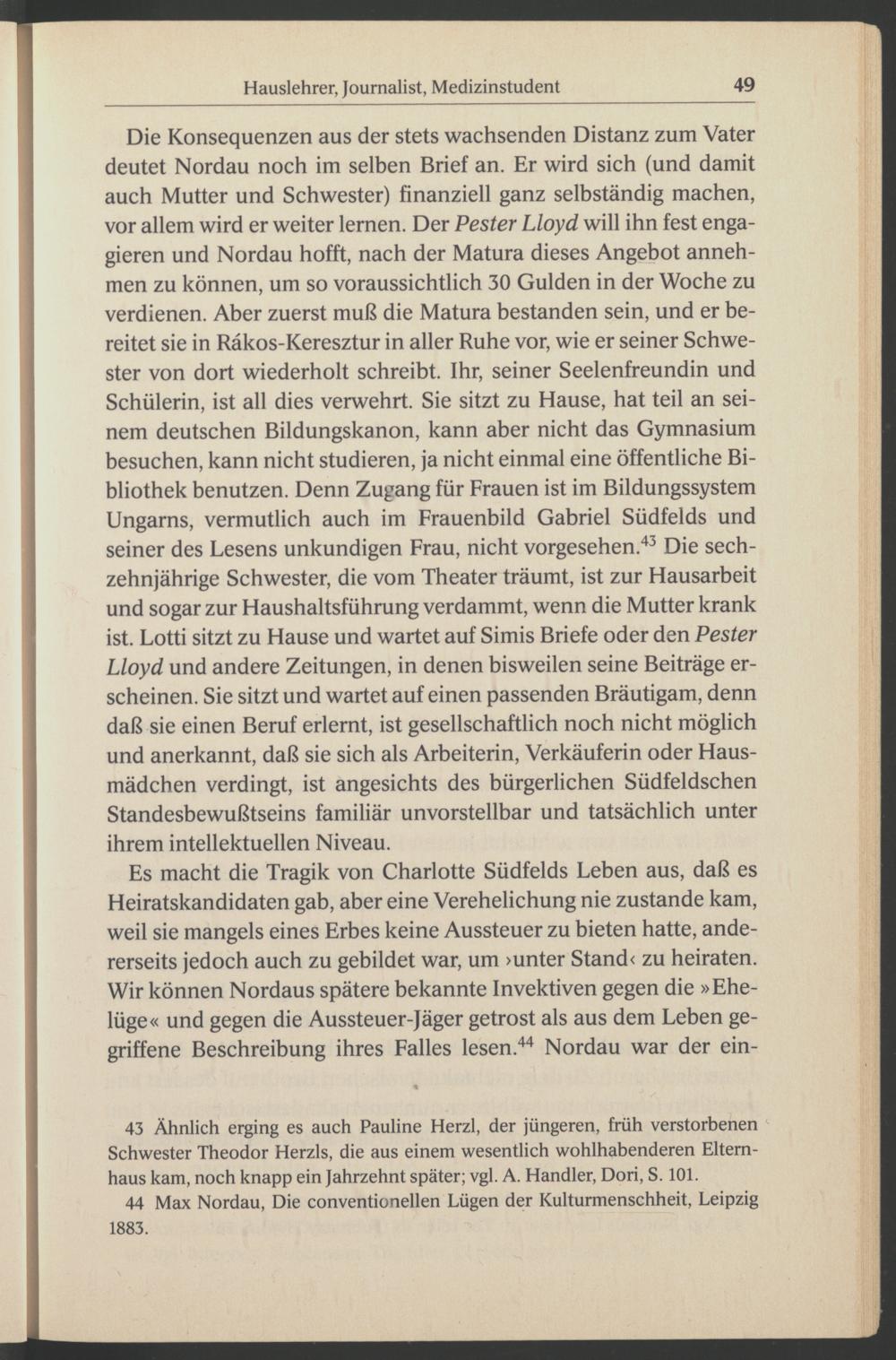 Die Konsequenzen aus der stets wachsenden Distanz zum Vater deutet Nordau noch im selben Brief an. Er wird sich (und damit auch Mutter und Schwester) finanziell ganz selbständig machen, vor allem wird er weiter lernen. Der Fester Lloyd will ihn fest engagieren und Nordau hofft, nach der Matura dieses Angebot annehmen zu können, um so voraussichtlich 30 Gulden in der Woche zu verdienen. Aber zuerst muß die Matura bestanden sein, und er bereitet sie in Räkos-Keresztur in aller Ruhe vor, wie er seiner Schwester von dort wiederholt schreibt. Ihr, seiner Seelenfreundin und Schülerin, ist all dies verwehrt. Sie sitzt zu Hause, hat teil an seinem deutschen Bildungskanon, kann aber nicht das Gymnasium besuchen, kann nicht studieren, ja nicht einmal eine öffentliche Bibliothek benutzen. Denn Zugang für Frauen ist im Bildungssystem Ungarns , vermutlich auch im Frauenbild Gabriel Südfelds und seiner des Lesens unkundigen Frau, nicht vorgesehen. 43 Die sechzehnjährige Schwester, die vom Theater träumt, ist zur Hausarbeit und sogar zur Haushaltsführung verdammt, wenn die Mutter krank ist. Lotti sitzt zu Hause und wartet auf Simis Briefe oder den Pester Lloyd und andere Zeitungen, in denen bisweilen seine Beiträge erscheinen. Sie sitzt und wartet auf einen passenden Bräutigam, denn daß sie einen Beruf erlernt, ist gesellschaftlich noch nicht möglich und anerkannt, daß sie sich als Arbeiterin, Verkäuferin oder Hausmädchen verdingt, ist angesichts des bürgerlichen Südfeldschen Standesbewußtseins familiär unvorstellbar und tatsächlich unter ihrem intellektuellen Niveau.