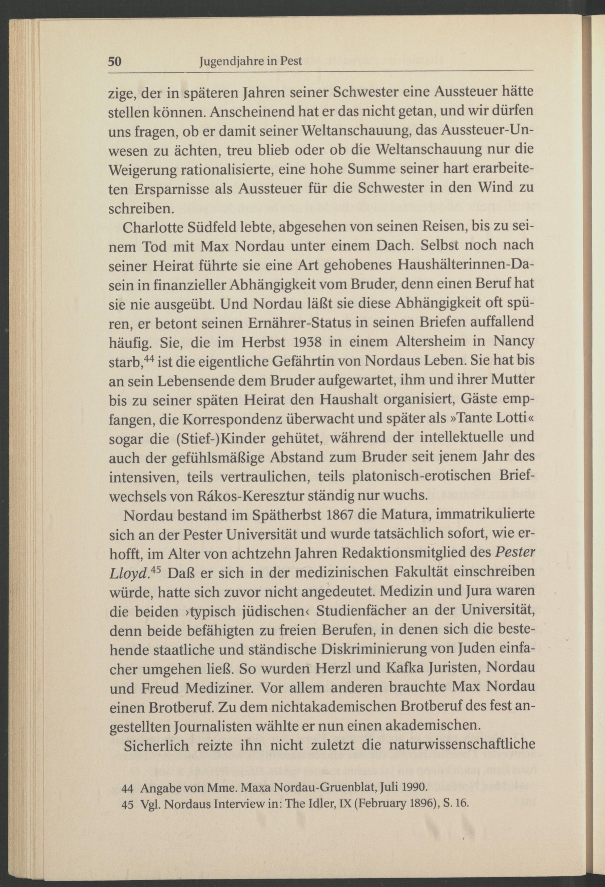 Nordau bestand im Spätherbst 1867 die Matura, immatrikulierte sich an der Pester Universität und wurde tatsächlich sofort, wie erhofft, im Alter von achtzehn Jahren Redaktionsmitglied des Pester Lloyd. 45 Daß er sich in der medizinischen Fakultät einschreiben würde, hatte sich zuvor nicht angedeutet. Medizin und Jura waren die beiden >typisch jüdischem Studienfächer an der Universität, denn beide befähigten zu freien Berufen, in denen sich die bestehende staatliche und ständische Diskriminierung von Juden einfacher umgehen ließ. So wurden Herzl und Kafka Juristen, Nordau und Freud Mediziner. Vor allem anderen brauchte Max Nordau einen Brotberuf. Zu dem nichtakademischen Brotberuf des fest an- gestellten Journalisten wählte er nun einen akademischen.