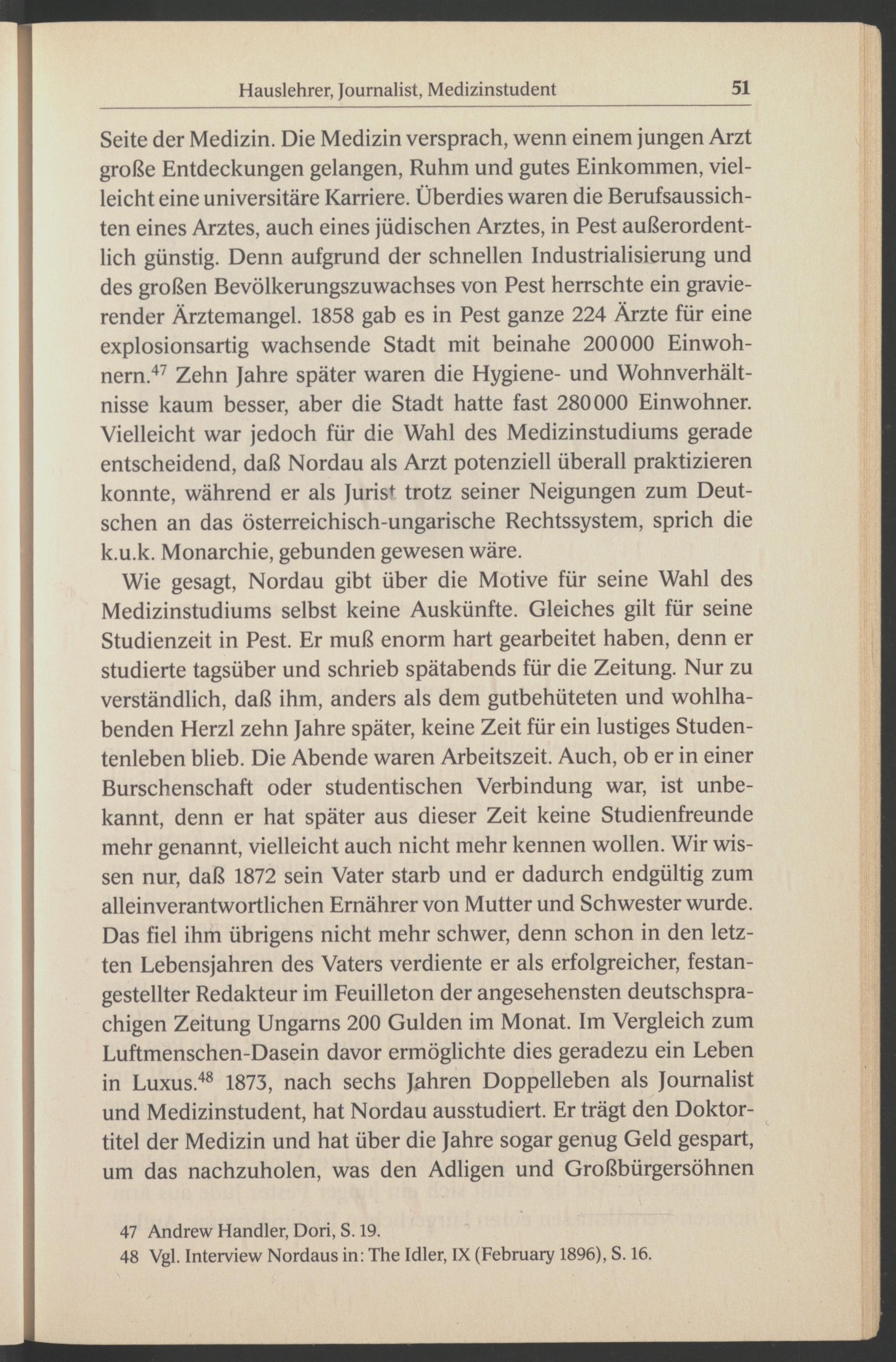 Wie gesagt, Nordau gibt über die Motive für seine Wahl des Medizinstudiums selbst keine Auskünfte. Gleiches gilt für seine Studienzeit in Pest. Er muß enorm hart gearbeitet haben, denn er studierte tagsüber und schrieb spätabends für die Zeitung. Nur zu verständlich, daß ihm, anders als dem gutbehüteten und wohlhabenden Herzl zehn Jahre später, keine Zeit für ein lustiges Studentenleben blieb. Die Abende waren Arbeitszeit. Auch, ob er in einer Burschenschaft oder studentischen Verbindung war, ist unbekannt, denn er hat später aus dieser Zeit keine Studienfreunde mehr genannt, vielleicht auch nicht mehr kennen wollen. Wir wissen nur, daß 1872 sein Vater starb und er dadurch endgültig zum alleinverantwortlichen Ernährer von Mutter und Schwester wurde. Das fiel ihm übrigens nicht mehr schwer, denn schon in den letzten Lebensjahren des Vaters verdiente er als erfolgreicher, festangestellter Redakteur im Feuilleton der angesehensten deutschsprachigen Zeitung Ungarns 200 Gulden im Monat. Im Vergleich zum Luftmenschen-Dasein davor ermöglichte dies geradezu ein Leben in Luxus. 48 1873, nach sechs Jahren Doppelleben als Journalist und Medizinstudent, hat Nordau ausstudiert. Er trägt den Doktortitel der Medizin und hat über die Jahre sogar genug Geld gespart, um das nachzuholen, was den Adligen und Großbürgersöhnen