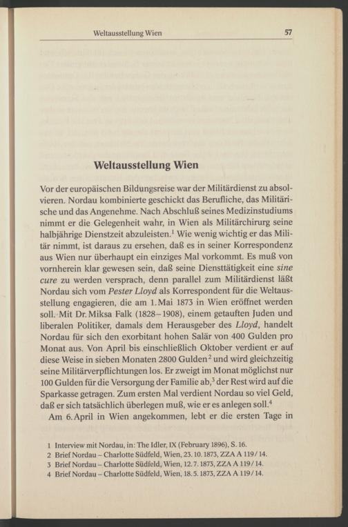 Vor der europäischen Bildungsreise war der Militärdienst zu absolvieren. Nordau kombinierte geschickt das Berufliche, das Militärische und das Angenehme. Nach Abschluß seines Medizinstudiums nimmt er die Gelegenheit wahr, in Wien als Militärchirurg seine halbjährige Dienstzeit abzuleisten. 1 Wie wenig wichtig er das Militär nimmt, ist daraus zu ersehen, daß es in seiner Korrespondenz aus Wien nur überhaupt ein einziges Mal vorkommt. Es muß von vornherein klar gewesen sein, daß seine Diensttätigkeit eine sine eure zu werden versprach, denn parallel zum Militärdienst läßt Nordau sich vom Pester Lloyd als Korrespondent für die Weltausstellung engagieren, die am l.Mai 1873 in Wien eröffnet werden soll. Mit Dr. Miksa Falk (1828-1908), einem getauften Juden und liberalen Politiker, damals dem Herausgeber des Lloyd, handelt Nordau für sich den exorbitant hohen Salär von 400 Gulden pro Monat aus. Von April bis einschließlich Oktober verdient er auf diese Weise in sieben Monaten 2800 Gulden 2 und wird gleichzeitig seine Militärverpflichtungen los. Er zweigt im Monat möglichst nur 100 Gulden für die Versorgung der Familie ab, 3 der Rest wird auf die Sparkasse getragen. Zum ersten Mal verdient Nordau so viel Geld, daß er sich tatsächlich überlegen muß, wie er es anlegen soll. 4