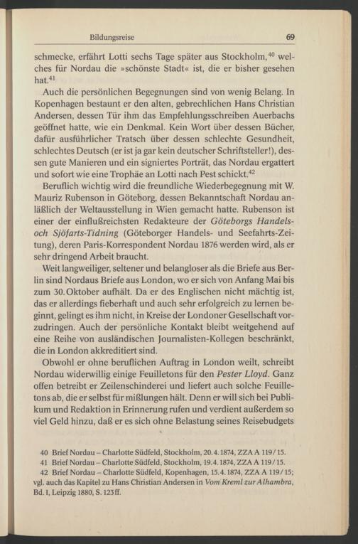 Auch die persönlichen Begegnungen sind von wenig Belang. In Kopenhagen bestaunt er den alten, gebrechlichen Hans Christian Andersen , dessen Tür ihm das Empfehlungsschreiben Auerbachs geöffnet hatte, wie ein Denkmal. Kein Wort über dessen Bücher, dafür ausführlicher Tratsch über dessen schlechte Gesundheit, schlechtes Deutsch (er ist ja gar kein deutscher Schriftsteller!), dessen gute Manieren und ein signiertes Porträt, das Nordau ergattert und sofort wie eine Trophäe an Lotti nach Pest schickt. 42