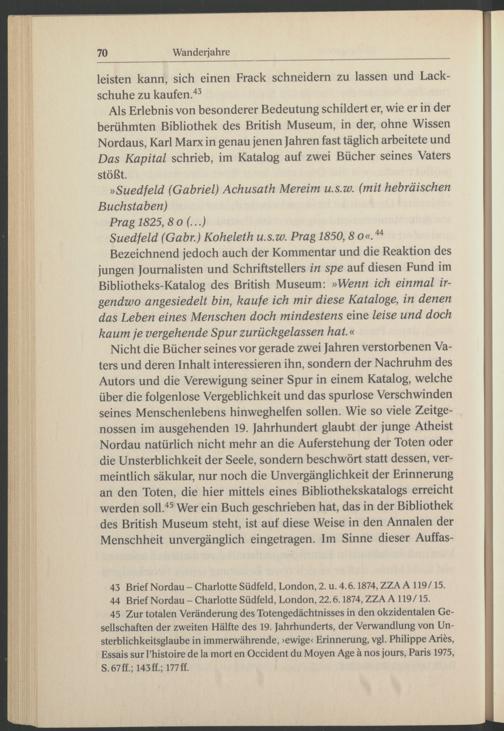Nicht die Bücher seines vor gerade zwei Jahren verstorbenen Vaters und deren Inhalt interessieren ihn, sondern der Nachruhm des Autors und die Verewigung seiner Spur in einem Katalog, welche über die folgenlose Vergeblichkeit und das spurlose Verschwinden seines Menschenlebens hinweghelfen sollen. Wie so viele Zeitgenossen im ausgehenden 19. Jahrhundert glaubt der junge Atheist Nordau natürlich nicht mehr an die Auferstehung der Toten oder die Unsterblichkeit der Seele, sondern beschwört statt dessen, vermeintlich säkular, nur noch die Unvergänglichkeit der Erinnerung an den Toten, die hier mittels eines Bibliothekskatalogs erreicht werden soll. 45 Wer ein Buch geschrieben hat, das in der Bibliothek des British Museum steht, ist auf diese Weise in den Annalen der Menschheit unvergänglich eingetragen. Im Sinne dieser Auffas-