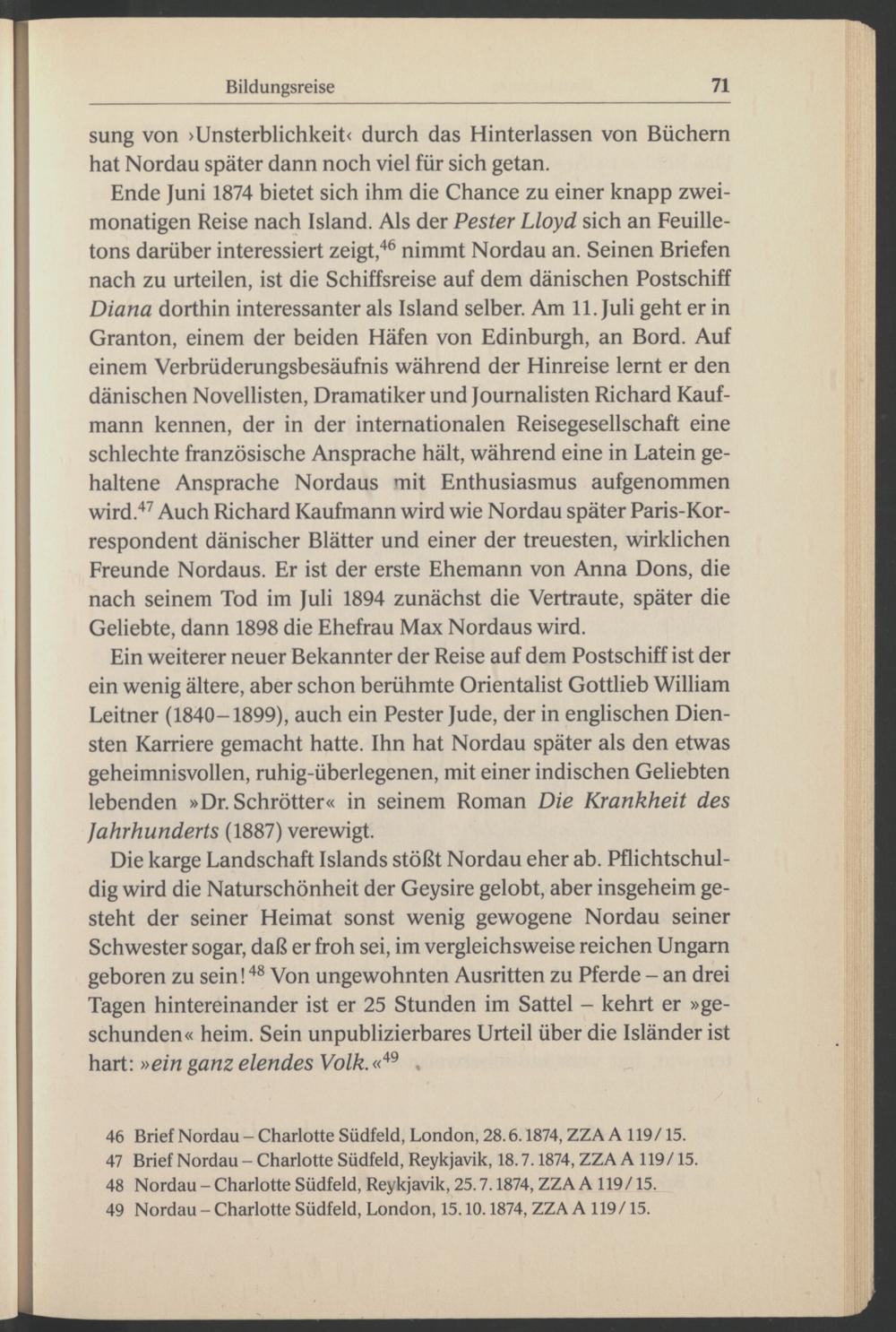 Ende Juni 1874 bietet sich ihm die Chance zu einer knapp zweimonatigen Reise nach Island . Als der Pester Lloyd sich an Feuilletons darüber interessiert zeigt, 46 nimmt Nordau an. Seinen Briefen nach zu urteilen, ist die Schiffsreise auf dem dänischen Postschiff Diana dorthin interessanter als Island selber. Am 11. Juli geht er in Granton, einem der beiden Häfen von Edinburgh , an Bord. Auf einem Verbrüderungsbesäufnis während der Hinreise lernt er den dänischen Novellisten, Dramatiker und Journalisten Richard Kaufmann kennen, der in der internationalen Reisegesellschaft eine schlechte französische Ansprache hält, während eine in Latein gehaltene Ansprache Nordaus mit Enthusiasmus aufgenommen wird. 47 Auch Richard Kaufmann wird wie Nordau später Paris -Korrespondent dänischer Blätter und einer der treuesten, wirklichen Freunde Nordaus. Er ist der erste Ehemann von Anna Dons, die nach seinem Tod im Juli 1894 zunächst die Vertraute, später die Geliebte, dann 1898 die Ehefrau Max Nordaus wird.