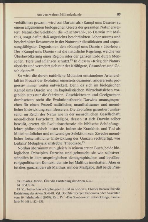 85 Zur biblischen Schöpfungslehre und zu Leibniz s. Charles Darwin über die Entstehung der Arten, S. 484ff. Vgl. Dolf Stemberger, Panorama oder Ansichten vom 19. Jahrhundert (1938), Kap. IV: »Das Zauberwort Entwicklung«, Frank furt/M . 1981,112-156.