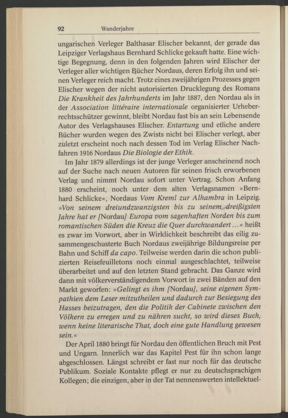 Im Jahr 1879 allerdings ist der junge Verleger anscheinend noch auf der Suche nach neuen Autoren für seinen frisch erworbenen Verlag und nimmt Nordau sofort unter Vertrag. Schon Anfang 1880 erscheint, noch unter dem alten Verlagsnamen »Bernhard Schlicke«, Nordaus Vom Kreml zur Alhambra in Leipzig . »Von seinem dreiundzwanzigsten bis zu seinem .dreißigsten Jahre hat er /Nordau / Europa vom sagenhaften Norden bis zum romantischen Süden die Kreuz die Quer durchwandert...« heißt es zwar im Vorwort, aber in Wirklichkeit beschreibt das eilig zusammengeschusterte Buch Nordaus zweijährige Bildungsreise per Bahn und Schiff da capo. Teilweise werden darin die schon publizierten Reisefeuilletons noch einmal ausgeschlachtet, teilweise überarbeitet und auf den letzten Stand gebracht. Das Ganze wird dann mit völkerverständigendem Vorwort in zwei Bänden auf den Markt geworfen: »Gelingt es ihm /Nordau/ , seine eigenen Sympathien dem Leser mitzutheilen und dadurch zur Besiegung des Hasses beizutragen, den die Politik der Cabinete zwischen den Völkern zu erregen und zu nähren sucht, so wird dieses Buch, wenn keine literarische That, doch eine gute Handlung gewesen sein.«