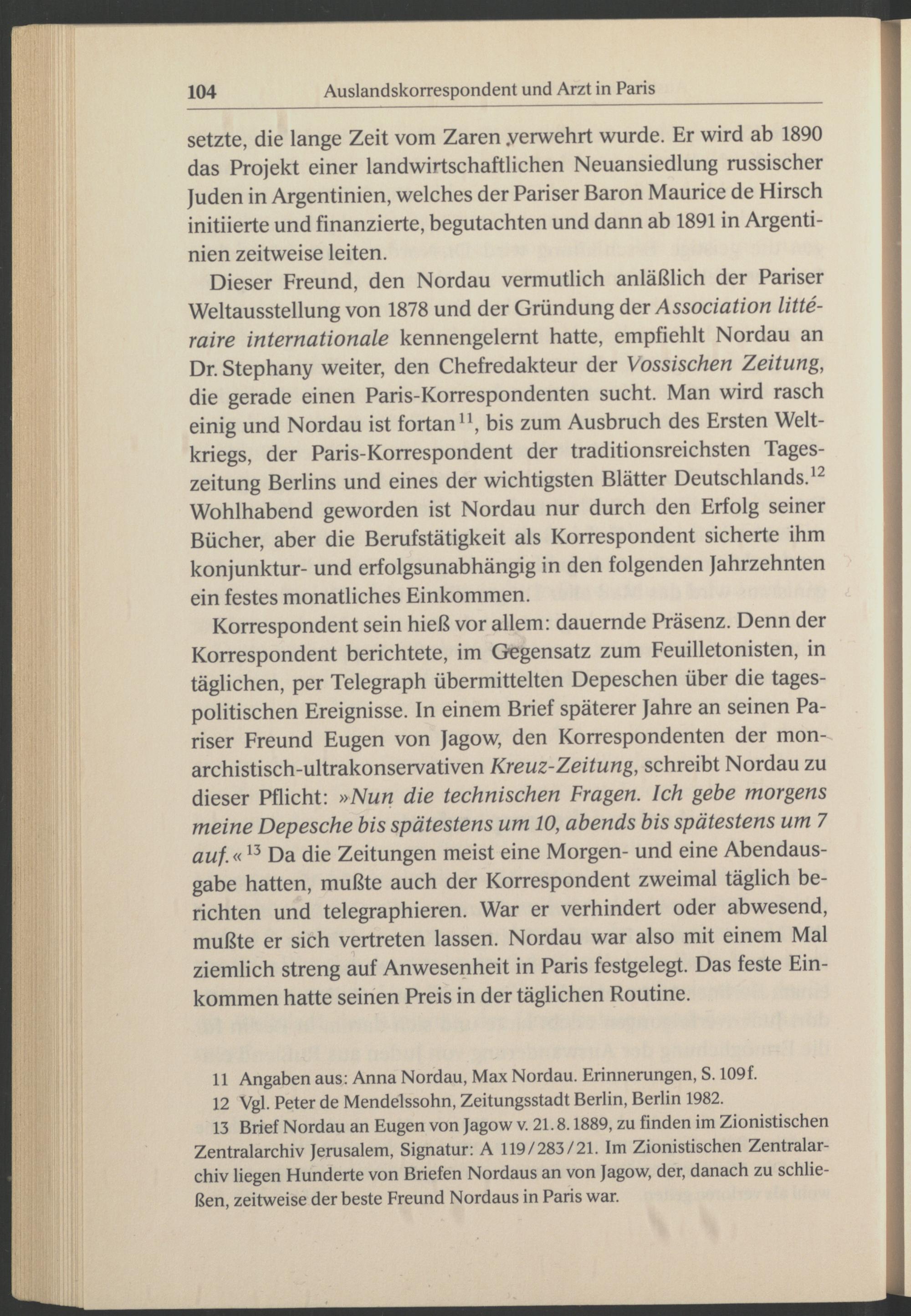 Dieser Freund, den Nordau vermutlich anläßlich der Pariser Weltausstellung von 1878 und der Gründung der Association litte- raire internationale kennengelemt hatte, empfiehlt Nordau an Dr. Stephany weiter, den Chefredakteur der Vossischen Zeitung, die gerade einen Paris -Korrespondenten sucht. Man wird rasch einig und Nordau ist fortan 11 , bis zum Ausbruch des Ersten Welt kriegs , der Paris -Korrespondent der traditionsreichsten Tageszeitung Berlins und eines der wichtigsten Blätter Deutschlands . 12 Wohlhabend geworden ist Nordau nur durch den Erfolg seiner Bücher, aber die Berufstätigkeit als Korrespondent sicherte ihm konjunktur- und erfolgsunabhängig in den folgenden Jahrzehnten ein festes monatliches Einkommen.
